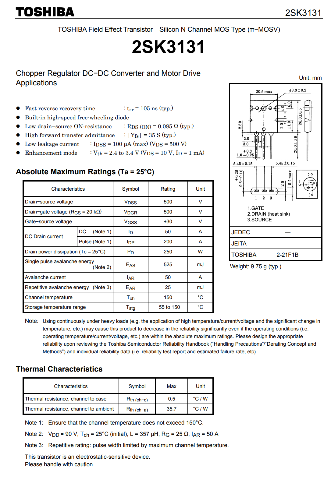 - 1X 2SK3131 Toshiba N Channel MOSFET 500V 50A 0.085Ohm 250W TO-3P