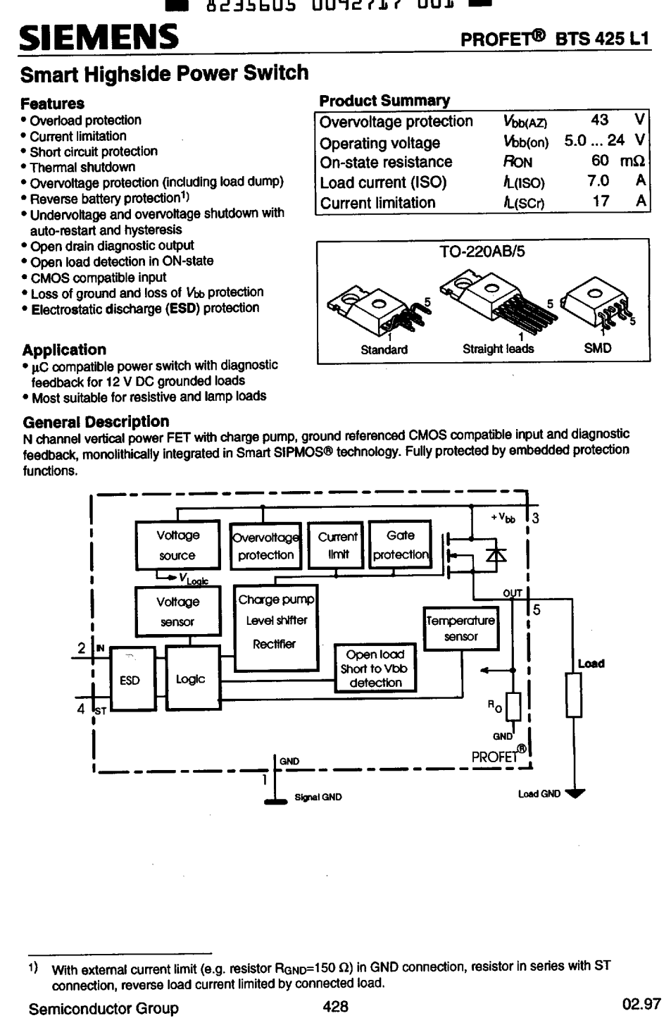 1 Piece - BTS425L1 Infineon Smart High Side Power Switch 7A TO-220