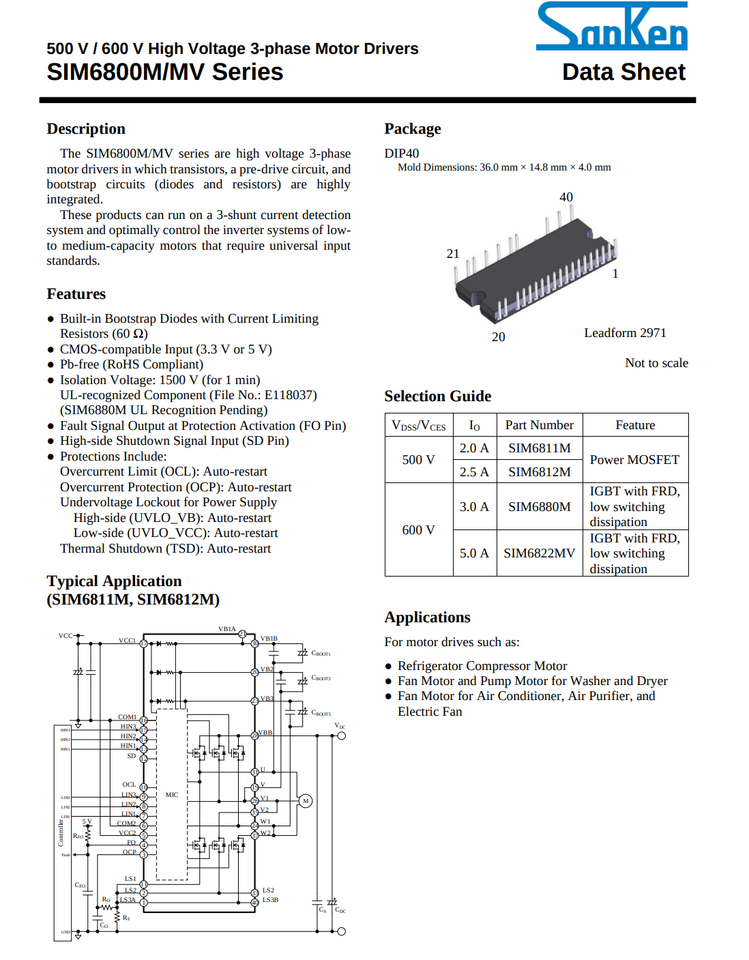 1 Piece - SIM6822M SANKEN IPM Motor Driver 600V 5A 3 Phase IGBT w/ FRD DIP40 Inverter
