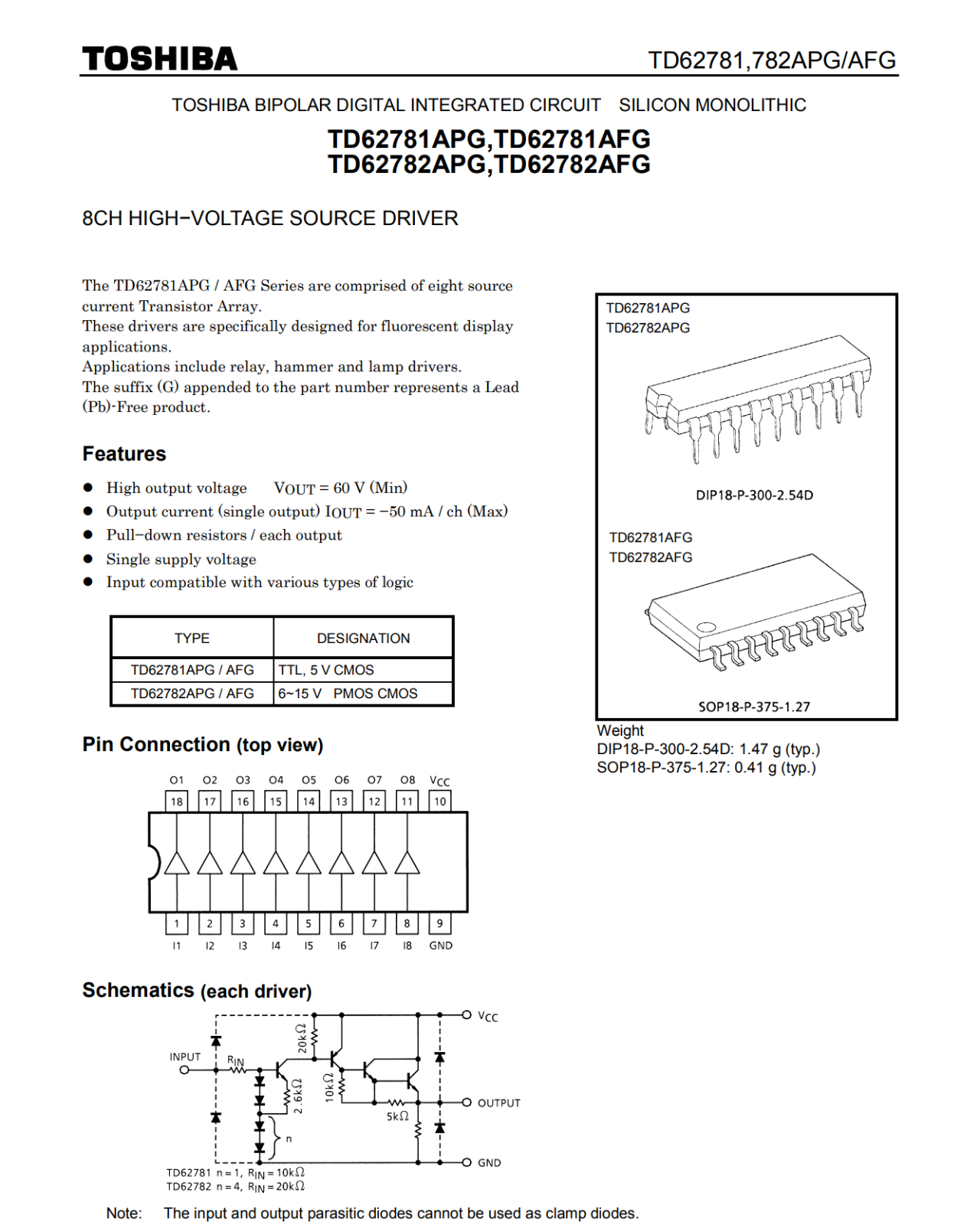 - 1X TD62782AP Toshiba 8-Channel High-Voltage Source Driver 60V 50mA DIP-18