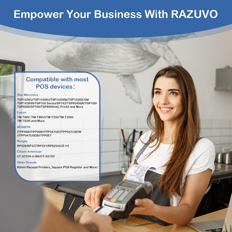 Wide Compatibility: Razuvo's printing paper is compatible with a wide range of 58mm Mini Thermal POS Printers, including Clover Flex Mobile POS, Clover Mini, Square Terminal Credit Card Machines, Royal Alpha, Nurit, Omni, VeriFone VX520, Remote Terminal Citizen CBM262, CBM270 EBW Auto Stik 950 EMCO, Ingenico ICT220, ICT250, First Data FD400, and more