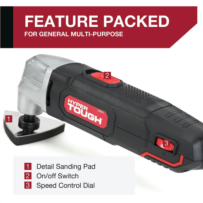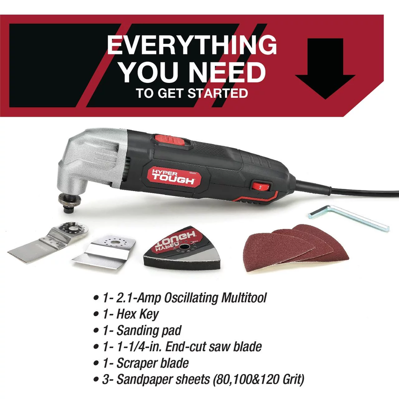 Hyper Tough 2.1 AMP Corded Oscillating Multi-function Tool, Variable Speed, with Hex Key, Sanding Pad, 1-1/4 inch Blade, Scraper Blade 3 Sanding Sheets (80, 100 120 Grit) Sealed bearings Soft-grip handle Can cut drywall openings, scrape adhesives, remove flooring and grind away mortar Comes with a die-cast aluminum housing Compact design Can be used to remove door casings, rails and baseboards without damaging the surface Includes a hex key, sanding pad, 1.25" end cut saw blade SK5, scraper and 3 pieces of sand paper (80, 100 and 120 grit 2.1 AMP oscillating multi tool for a wide range of creative, remodeling or household projects For more information or warranty information please contact the Hyper Tough Call Center at 1-833-908-2024