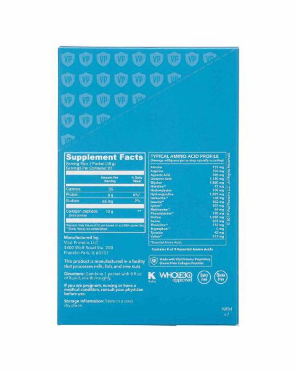 20 packets in each box Date of 02/13/2030 ? Explore Jennifer Aniston's Tips for Wellness ---- 'My go-to collagen routine is adding Vital Proteins' Collagen Peptides in my morning cup of coffee or smoothie - so easy to use.' ? Bioavailable Collagen Peptides Powder ---- Sourced from grass-fed, pasture-raised bovine to ensure high quality and sustainable source of this powerful ingredient. Digested and absorbed by the body quickly for maximum benefits. ? Certifications ----. Paleo Friendly Whole30 Approved. No added sugars or sweeteners. Gluten, cholesterol, and dairy free. Flavorless, odorless. ? 20g Collagen Powder per Serving ---- Provides 28 daily servings at 20g per serving. Scoop included inside the container for precise measuring. Each container is filled with exactly 20 oz of collagen powder, empty space inside is reserved for the measuring-scoop.