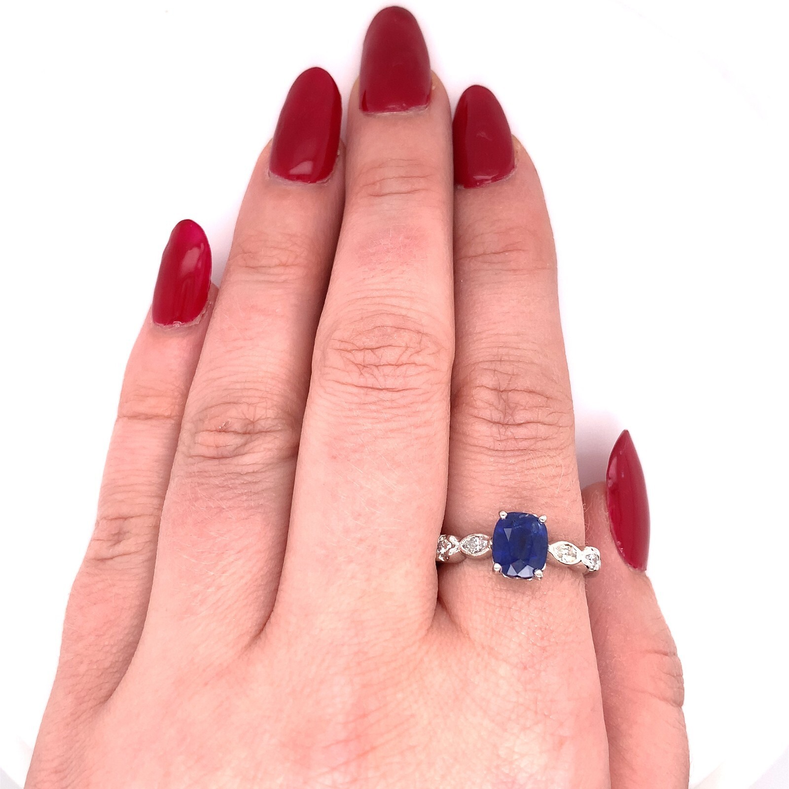 Platinum blue sapphire and diamond ring featuring a rectangular cushion cut sapphire weighing 2.13 carats. The genuine earth mined sapphire has royal blue color. It measures about 7.8mm x 6.6mm. The sapphire is accented by two marquise diamonds and two round brilliant cut diamonds. The four diamonds weigh about 1/4 carat total.