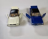 The product is a set of two 1965 Ford Mustang diecast toy cars in blue and black top cream and black top colors with pull back action. These 5.5" long vehicles feature opening doors and trunk, making them interactive for children to play with. The Ford Mustang model is a popular choice for collectors and fans of classic cars, offering a detailed and realistic design in a compact and portable form for on-the-go playtime. Normal wear. Sizes are approximate.