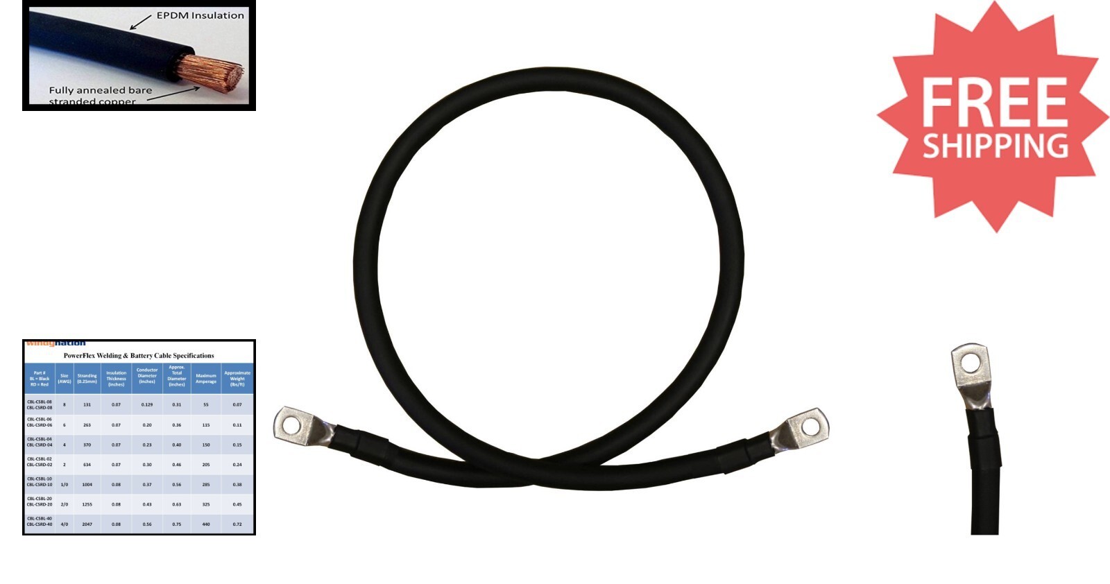 This high-quality, pre-assembled black 2 gauge marine-grade cable offers exceptional flexibility and durability. Crafted with 100% fine stranded pure copper, it is ideal for high-amperage applications. Customize your setup with selectable terminal mounting hole sizes (5/16" or 3/8") and cable lengths ranging from 9 inches to 7 feet. Manufactured in the USA by WindyNation Inc., it complies with SAE J1127 standards, rated for up to 600 volts and operating within -50C to +105C. Tinned, closed-end copper lugs provide corrosion resistance, while polyolefin heat shrink tubing ensures a secure and protected connection.