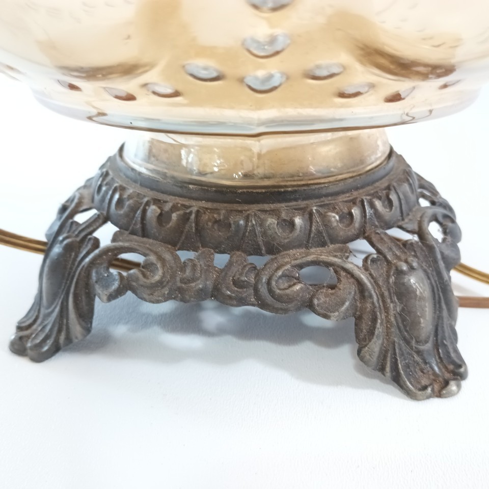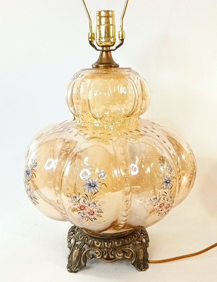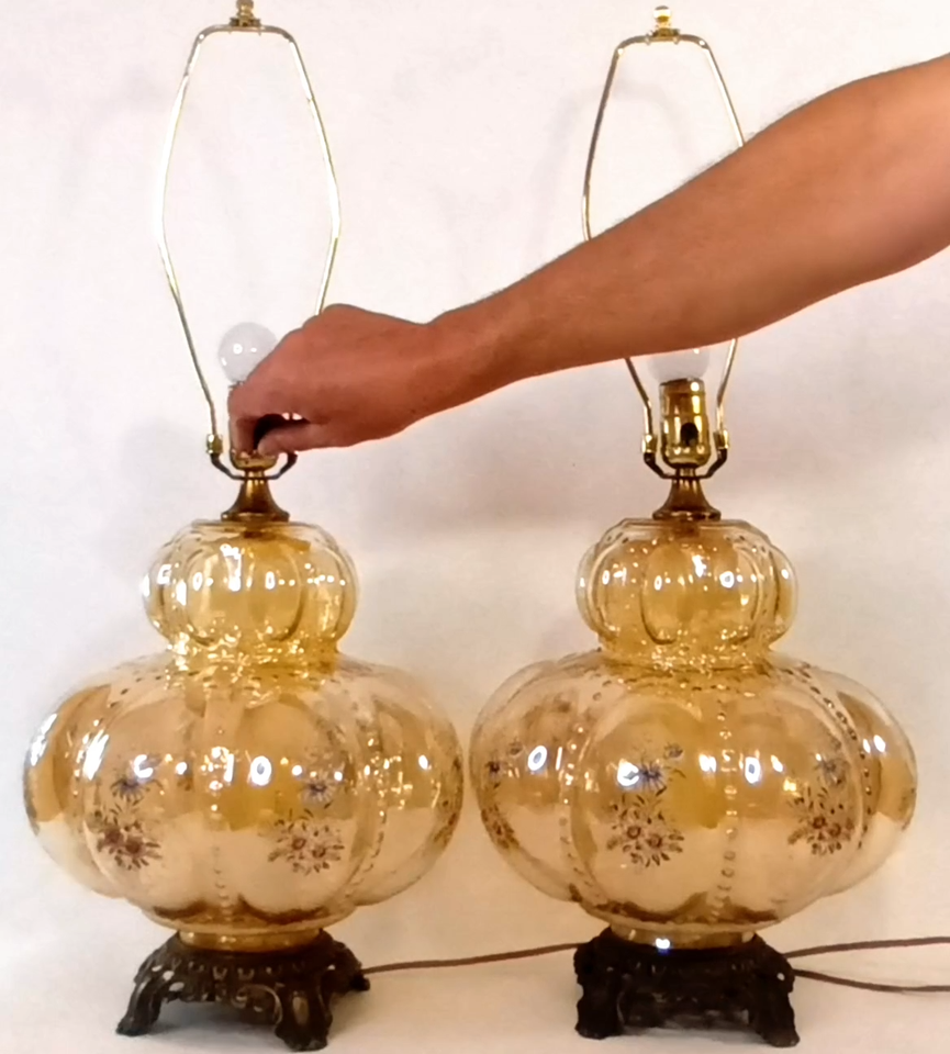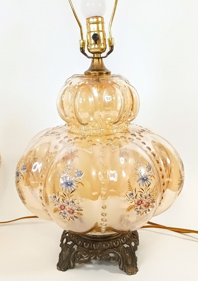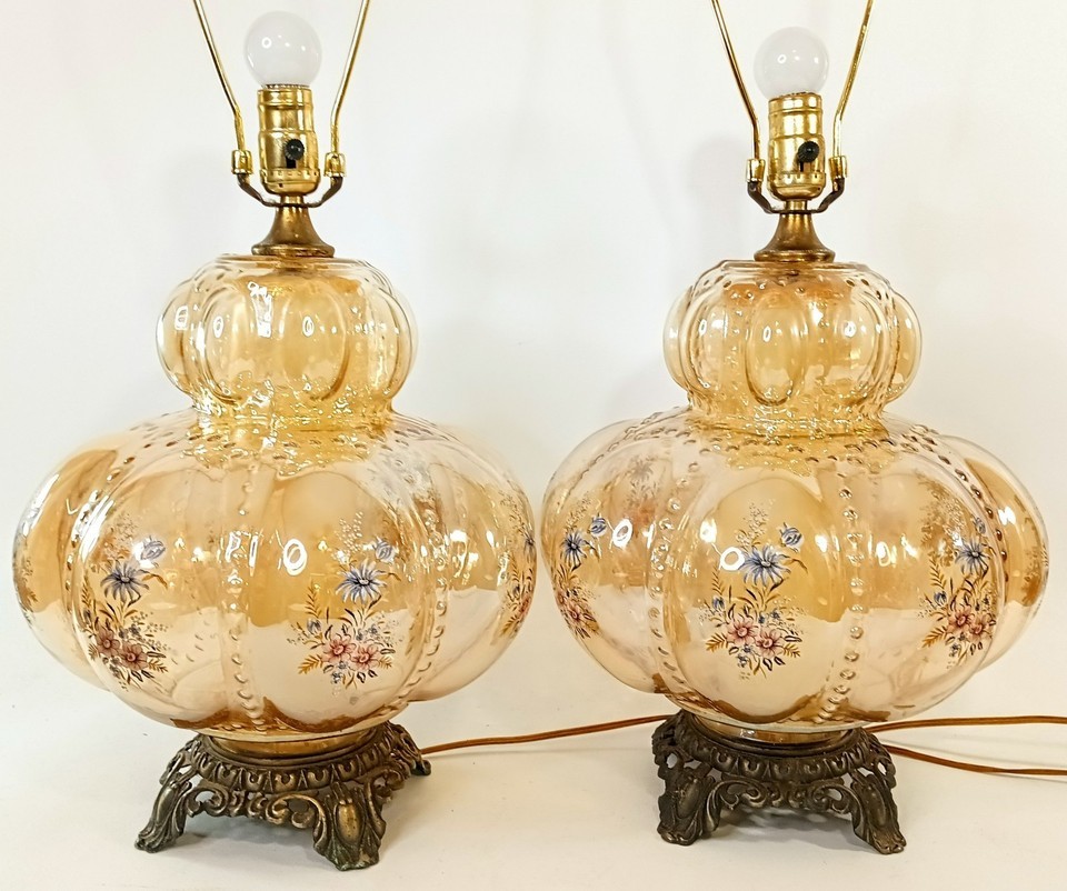 "The Carl Falkenstein Peach Lustre Beaded Bubble Lamps are large vintage table lamps from the 1960s, featuring a floral design with a glossy finish. These lamps have a white light color and are powered by a corded electric source with a voltage of 110V. Made of glass, the lamps have a unique beaded design and come in a set of 2. With a Retro Hollywood Regency style, these lamps are a perfect addition for those looking to add a touch of nostalgia to their decor."