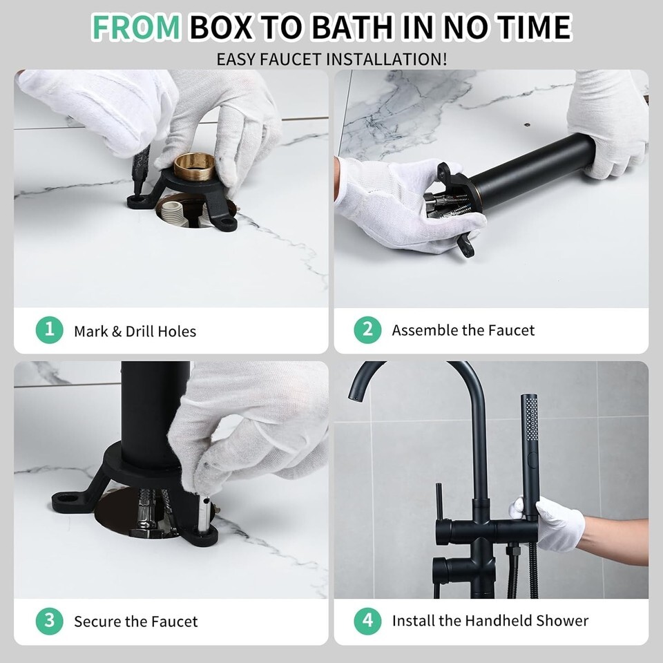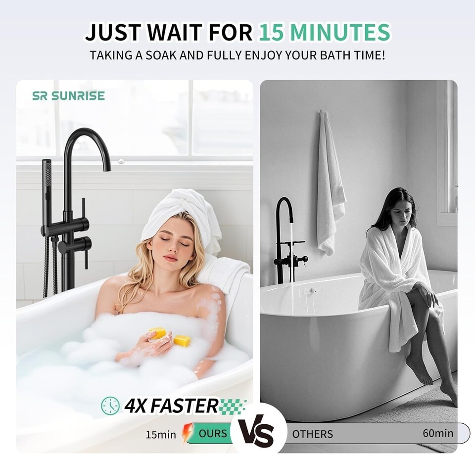 4GPM High Pressure Tub Filler: This high-pressure bathtub faucet fills your tub in no time, cutting filling time by 75% compared to others. In just 15 minutes, you can relax in your bath. Plus, the the CEC DOE certified SR SUN RISE freestanding faucet uses less water than others, saving you money without compromising performance.