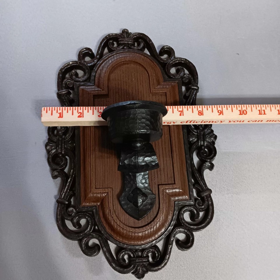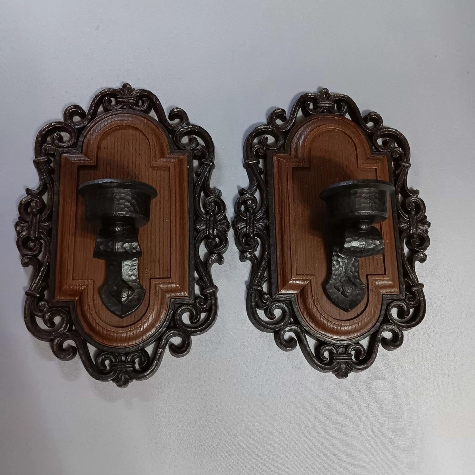 This vintage set of two MCM wall sconce candle holders in faux wood (plastic) adds a touch of gothic style to any space. The brown and black colors and gothic design make them suitable for all occasions and fitting for a wall-mounted display. Made of plastic, these decorative candle holders are a unique and stylish addition to any collection or home decor. Good condition with normal wear and sizes are approximate.