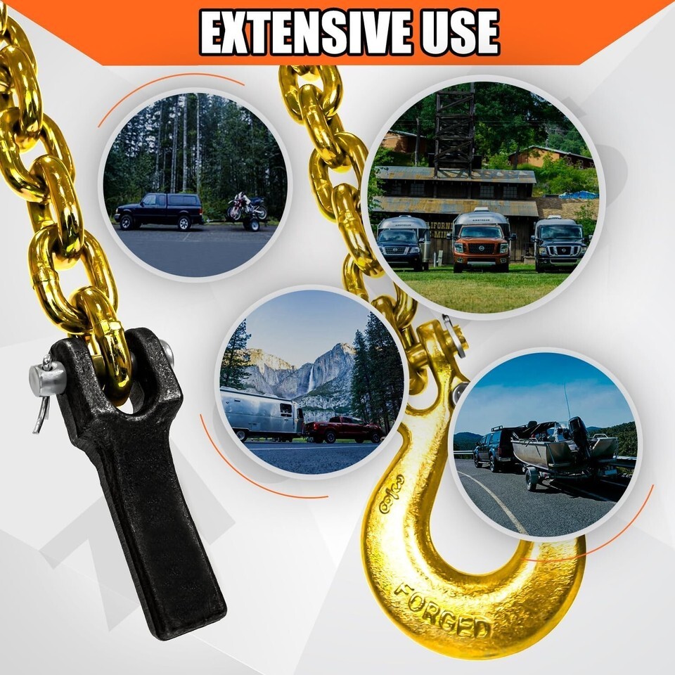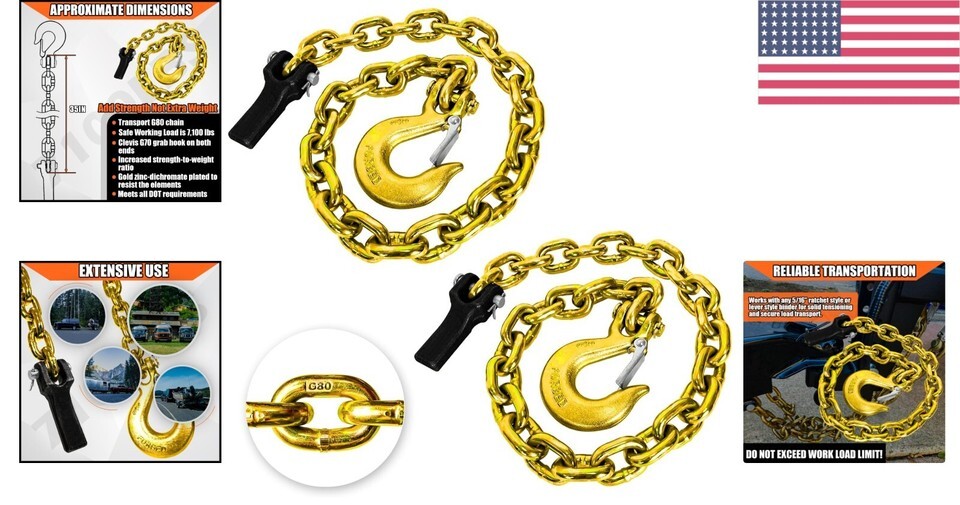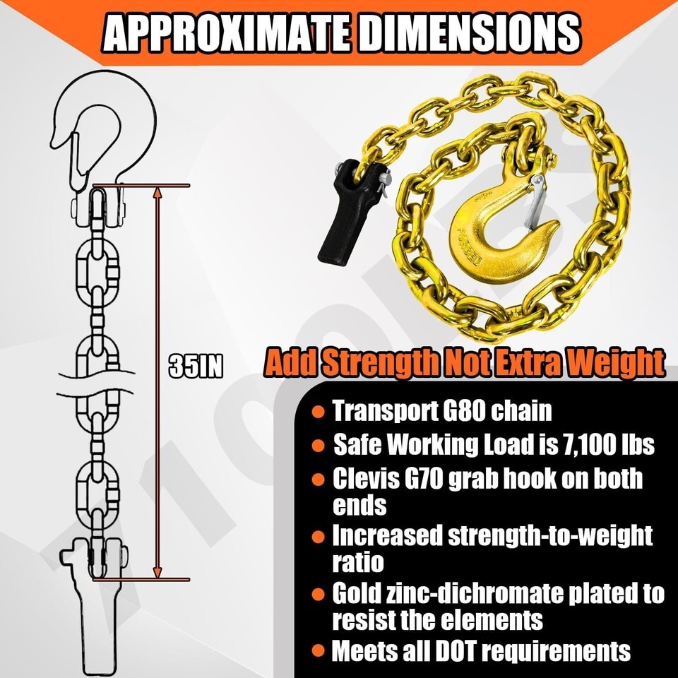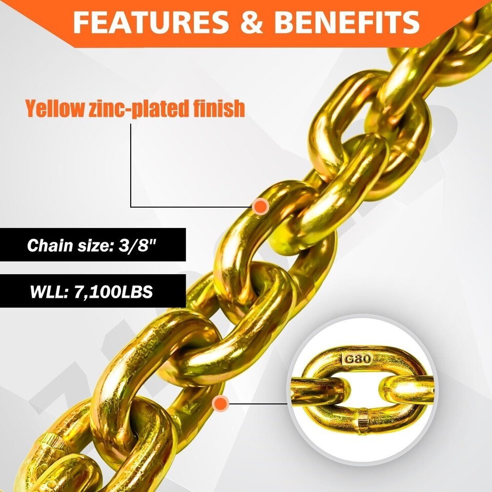 RELIABLE TRANSPORTATION: 36-inch chains designed to withstand heavy cargo with exceptional tensile strength and abrasion resistance. Corrosion-resistant yellow zinc chromate finish.