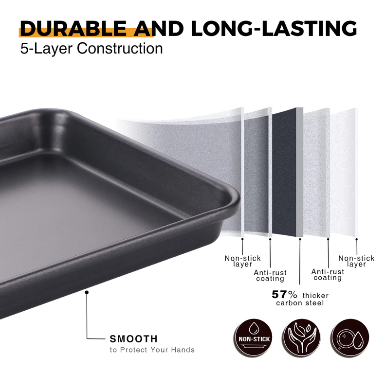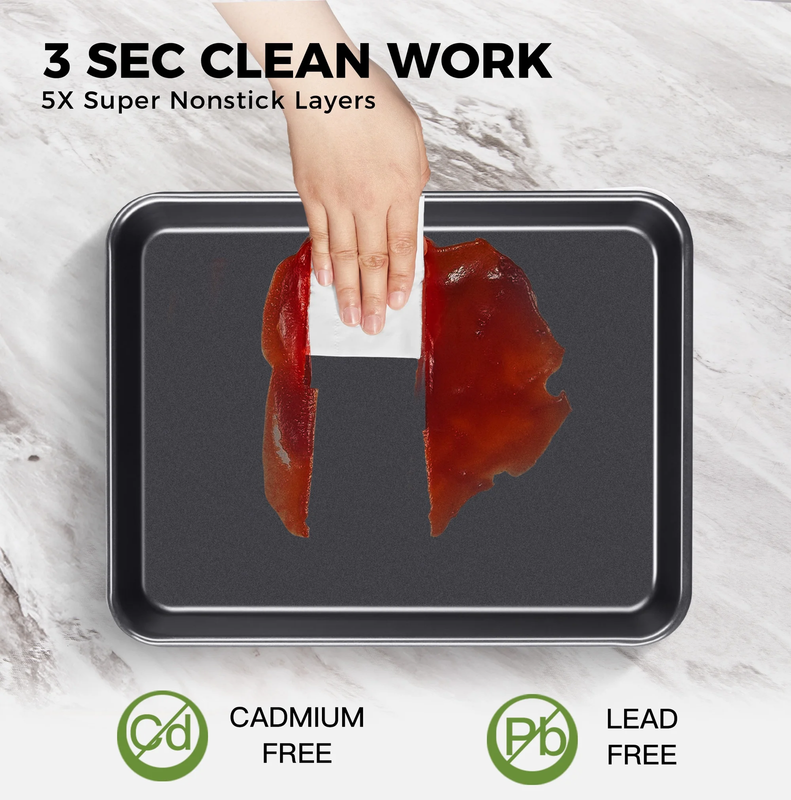 ??Premium Extra-Thick Material Dishwasher Safe?Crafted with 57% thicker carbon steel, these heavy-gauge convection oven pans and trays ensure stability, even heat distribution, and long-lasting durability. Backed by a peel-resistant warranty and rated for temperatures up to 450?.