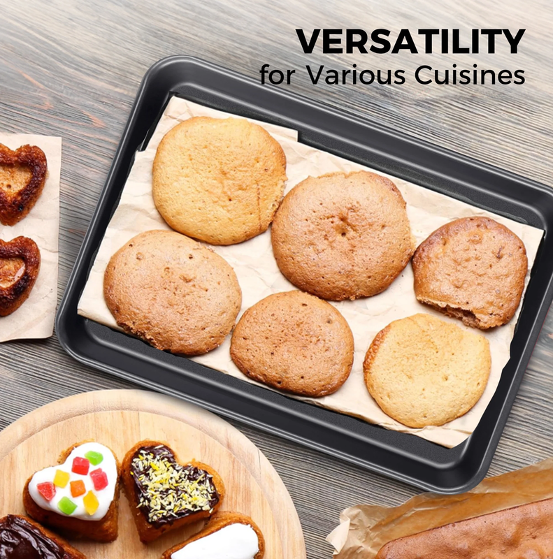Exclusive 9.6"x7.5" Toaster Oven Baking Sheet: 57% thicker carbon steel, Whitford-reinforced nonstick (34% silicon) for easy cleaning. Seamless, shatterproof design with rounded edges; stackable for storage. Perfect for cookies, pastries, veggies. 450? heat-resistant, 365-day guarantee?elevate your baking.
