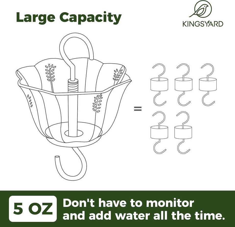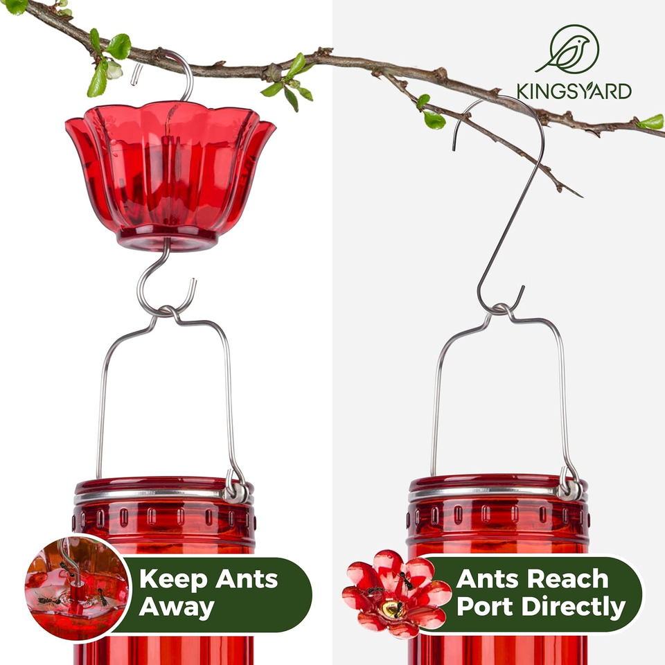 ?Easy to Use and Hang?Simply tighten the hooks at the top and bottom of the hummingbird feeder moat, pour water into the petals, hang the feeder, and then hang the feeder and ant moat together on a tree or shepherd's hook, and you'll get a loyal guard of the feeder.
