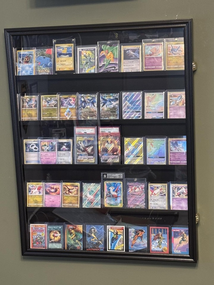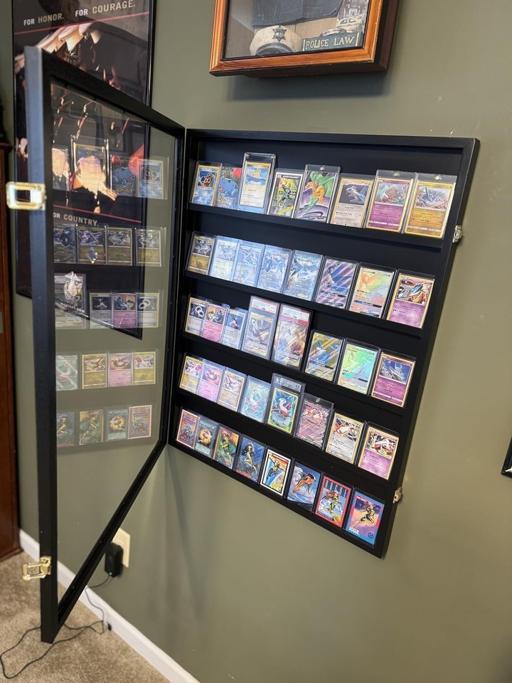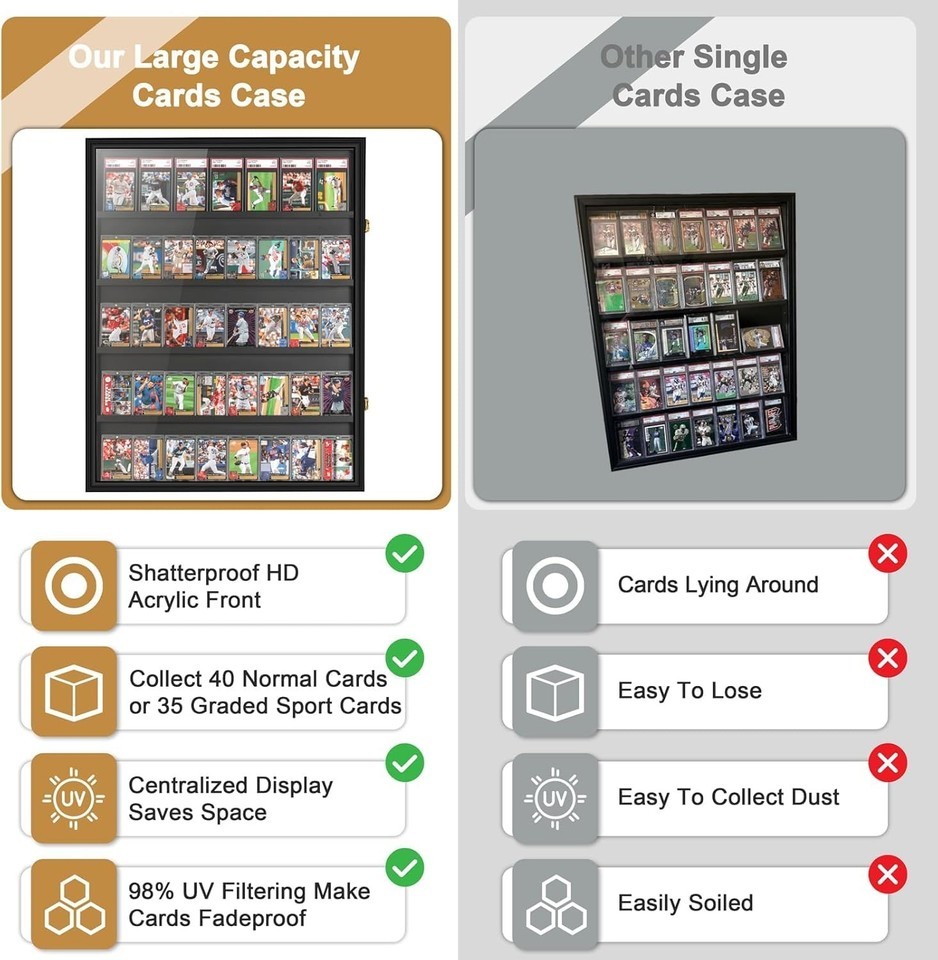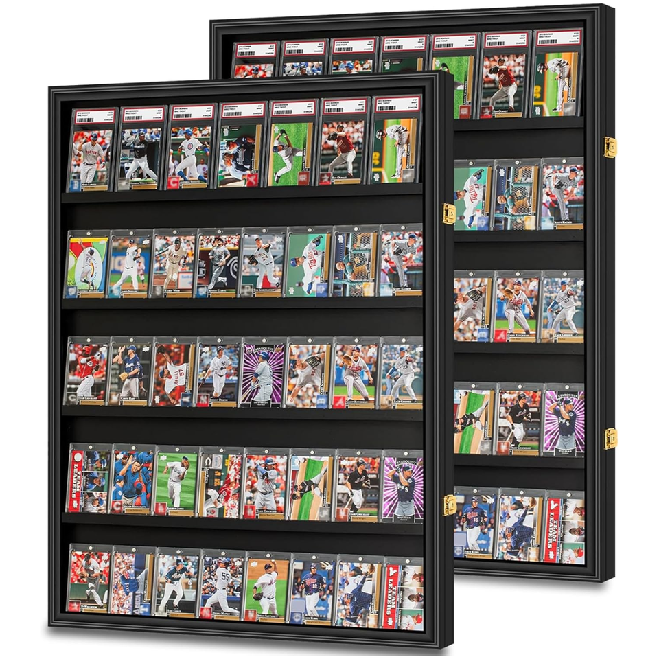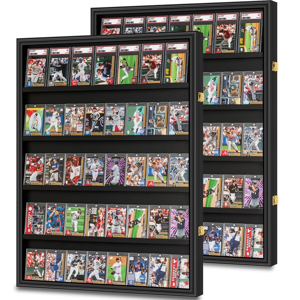 2 Pack Graded Trading Card Display Case Baseball Sports 35 PSA Slab Wood Frame ? Total capacity of 70 graded cards in both frames Showcase this display case in any room of your home?it?s designed to look great anywhere! Finding the right display case for your graded trading cards can be challenging, but this black case is the ultimate solution. With its black matted background, it provides an attractive way to showcase your collection of graded sports and trading cards, creating a display you?ll be proud of. Features: Wood in Black FINISH (Cards shown not included). Dimensions: 24" W 31" H 2.75" D with row spacing of 6" height per shelf 2-Pack Sports Card Display Cases: Each cabinet holds up to 40 standard trading cards or 35 graded cards, giving collectors a total capacity of 80 cards across both frames. Perfect for baseball, basketball, football, hockey, Pokemon, MTG, Yu-Gi-Oh, and more. Durable Wooden Frame with UV Protection: Crafted from premium wood with a matte anti-fading finish and fitted with a high-definition shatterproof acrylic door that blocks UV rays?keeping your cards safe from dust, scratches, and fading. Elegant Wall-Mount Cabinet Design: Features a sleek black finish with a rectangular cabinet shape, gold-plated lock, and front shelf baffles to prevent cards from slipping when the door is opened. Added Security with Lockable Door: Comes with a gold-plated lock to protect your valuable card collection while still providing a crystal-clear viewing display. Perfect Gift for Collectors: A thoughtful choice for card enthusiasts?ideal as a gift for birthdays, holidays, or special occasions, serving both as a storage solution and a display centerpiece. Shipping Return Policy We proudly offer FREE shipping on all orders within the lower 48 U.S. states. Please note that we do not offer combined shipping, local pickup, or delivery to P.O. boxes or APO/FPO addresses. Orders are processed within 1?3 business days. Most items arrive within 3?4 business days, though delivery may take up to 8 business days depending on the carrier. Any estimated arrival Customer satisfaction is very important to us, and we want you to have a great experience. If there are any issues with your order, please contact us directly before opening a case or requesting a return. This allows us to resolve the matter quickly and provide you with a return authorization if needed. We proudly offer 30-Day Free Returns for your convenience.