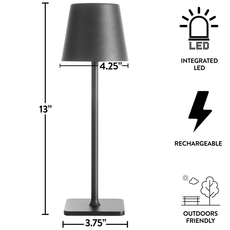 Set of 2 cordless table lamps Black Metal Finish 13" H x 4.25" W Cordless design for indoor outdoor use 3 dimming levels for customized lighting Touch controls for easy operation Rechargeable with included USB cable Portable and lightweight for flexibility Water-resistant for outdoor durability Perfect for patios, bedrooms, or anywhere you need extra light ? without the cords.