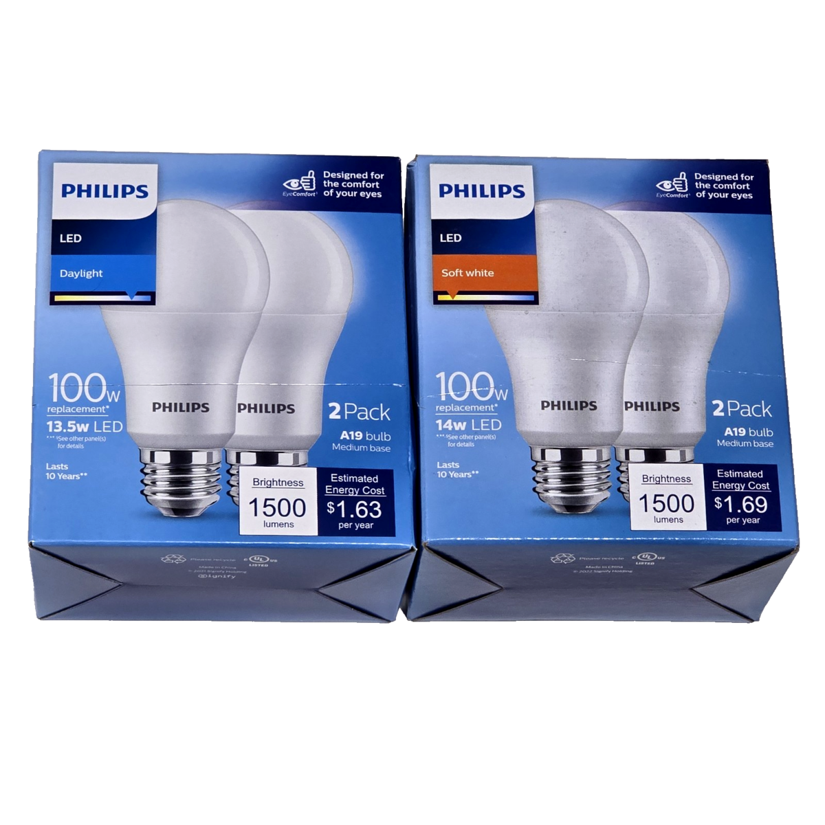 - 2 Pack Of 2 Phillips LED Daylight 100w Replacement 13.5w LED A19 Bulb Medium