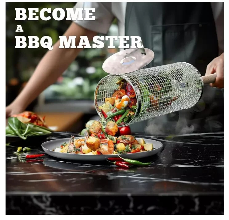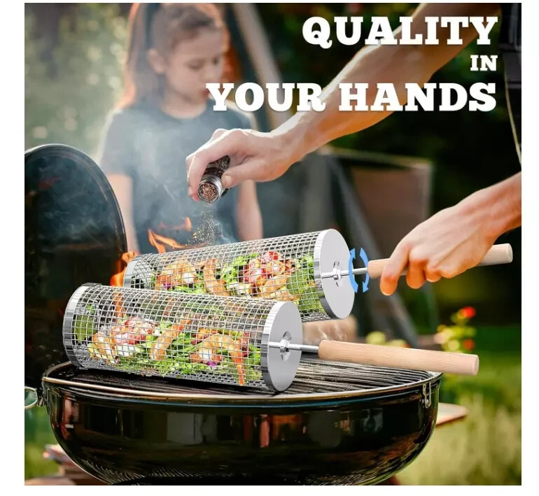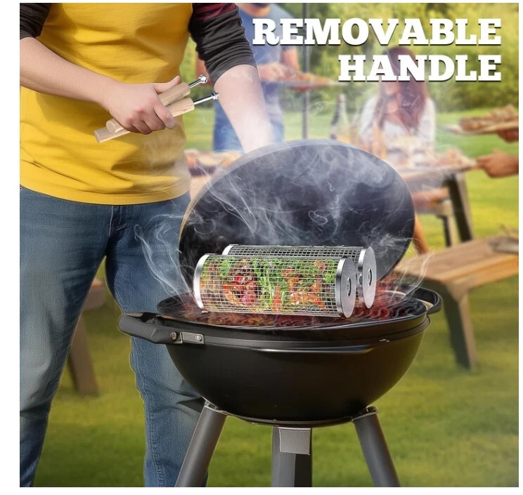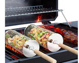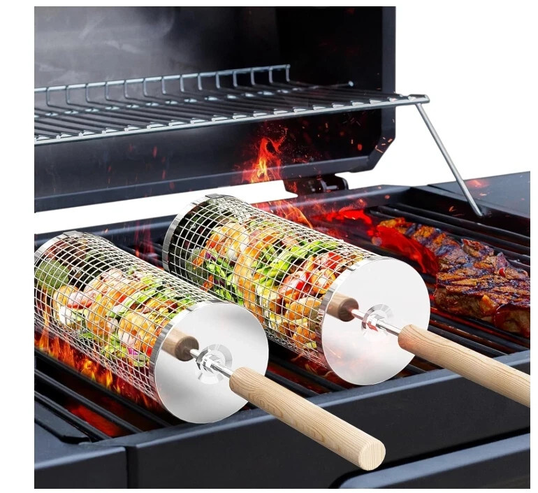 - 2 Pack Round Rolling Grilling Basket Stainless Steel For BBQ Grill Tool Handle