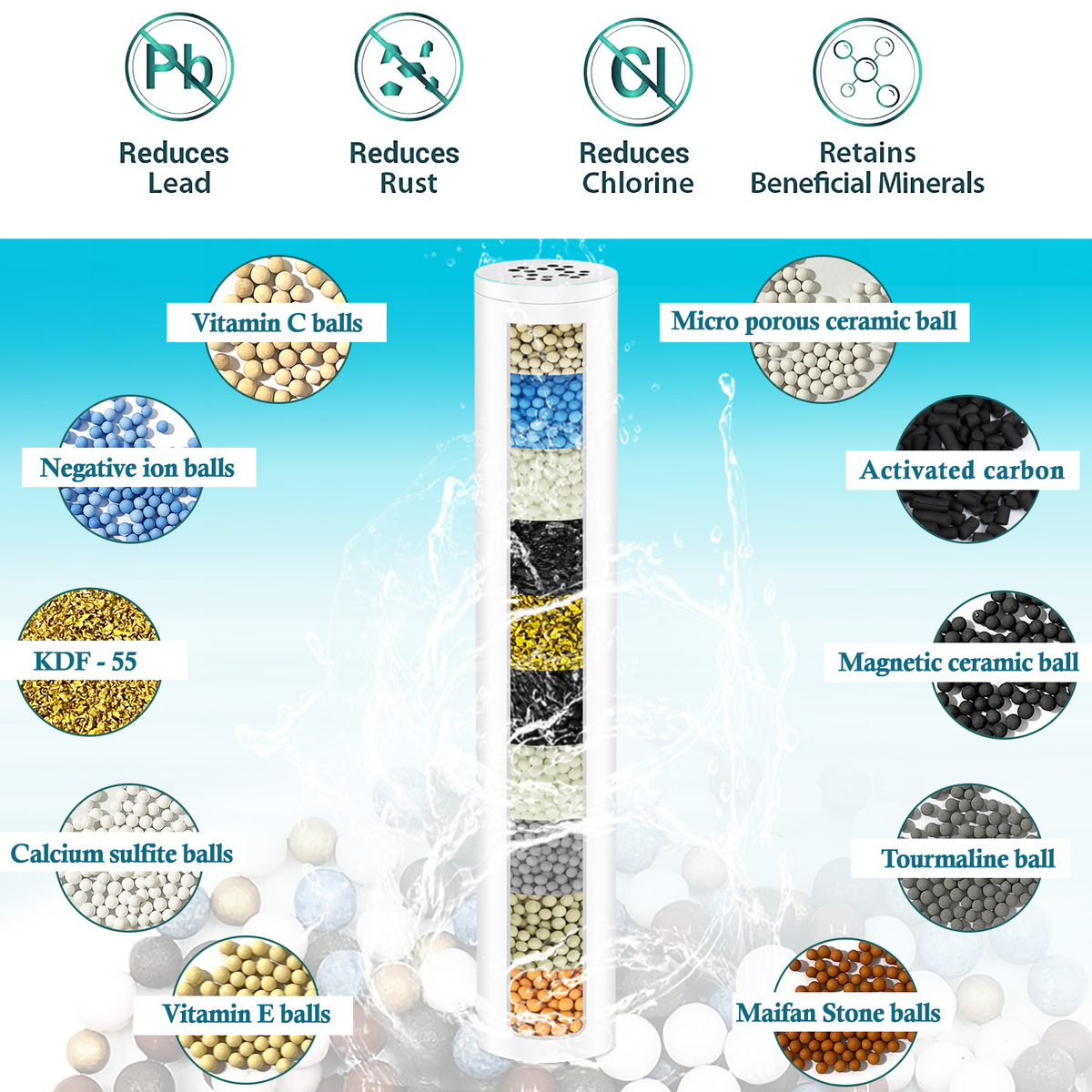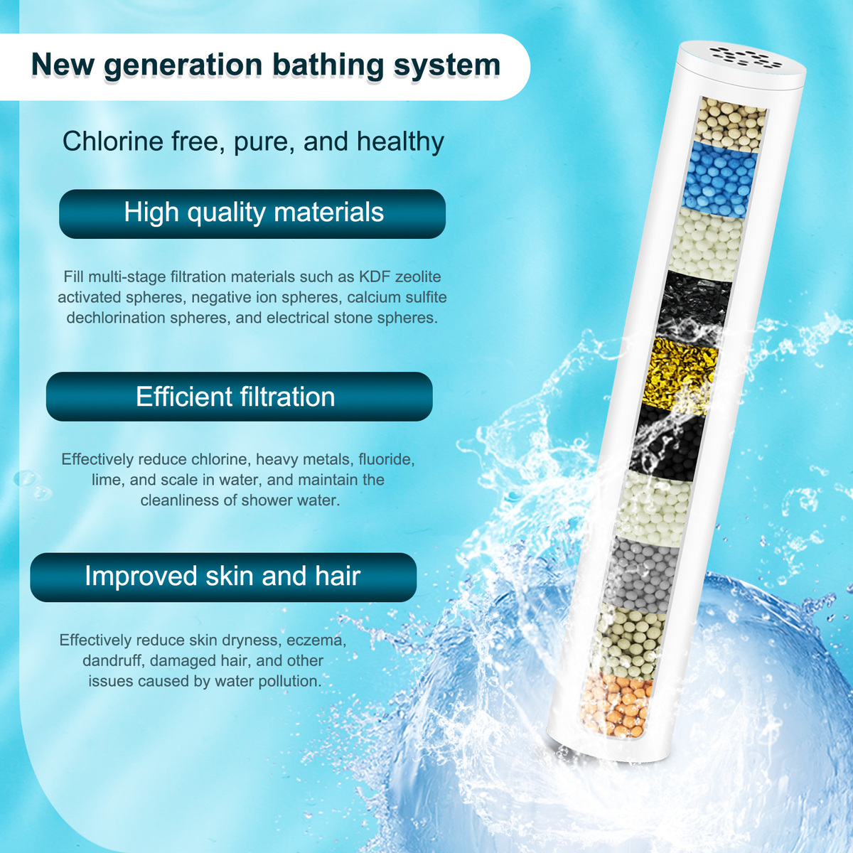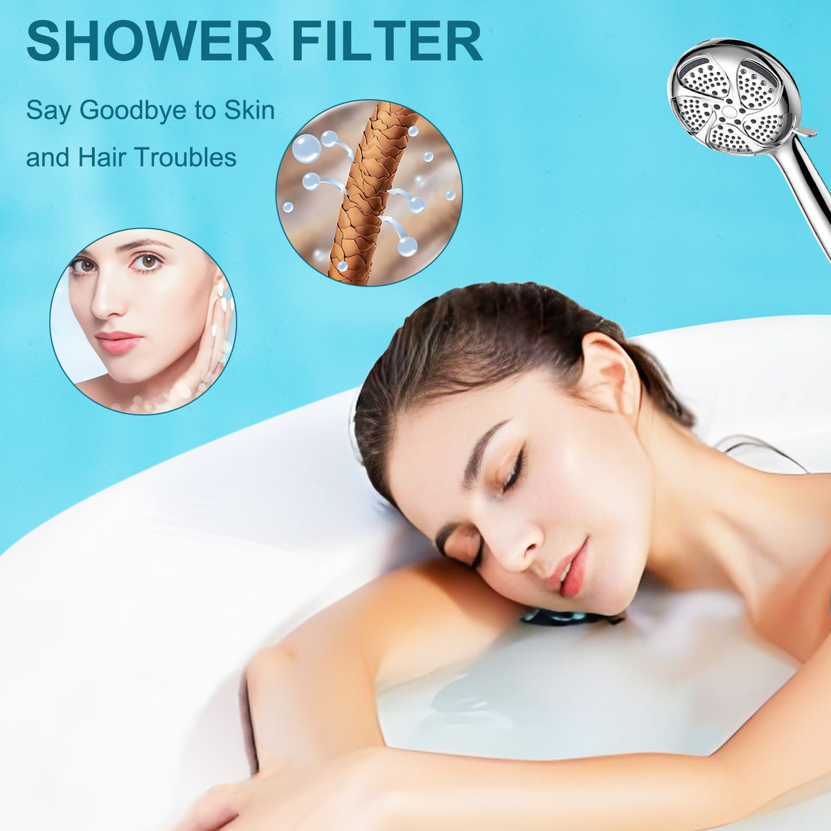 Our Multi-stages shower filter can effectively reduce chlorine, fluoride, heavy metals, rust, sand and other sediment. It effectively controls scale buildup and restores the damage caused by hard water and chemicals to your hair, skin, and nails.