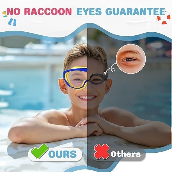 Comfortable Large Frame Design The large frame design provides extra comfort for kids and can effectively protect your child's eyes, and the soft silicone seal ensures a tight fit and prevents leaks.