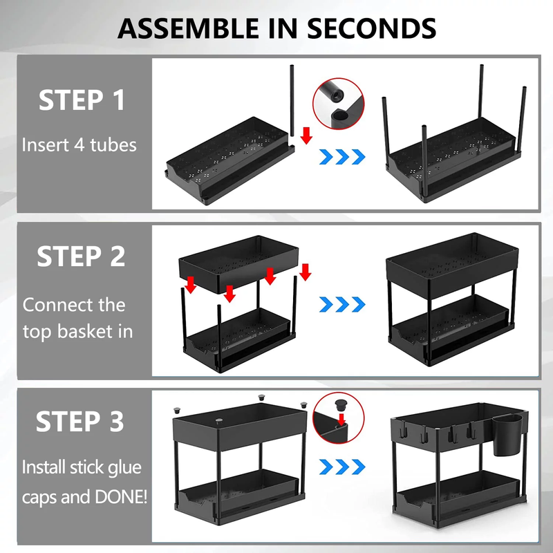 SLIDING DESIGN: Under sink organizer features a top basket and one slide-out drawer, The sliding drawer design allows you easier access what's hiding in the back of your sink and solve the trouble of bending over to find things. The smoothly and quietly slide out cabinet organizer aims to solve the trouble of bending over to find something under the sink, can be pulled out by the handles for easy access to items. LARGE CAPACITY: Different from other small kitchen organizer, PHANCIR Large Capacity Kitchen sink organizers measures: 14.57"L x 7.87"W x 13.18"H. Drawer Height: 1.77'' - 1.97''; Drawer Width: 6.5''- 7.87". Bottom area holds items height up to 11 inches, 4 side hooks and 1 hanging cup included for extra storage. HIGH QUALITY FUNCTIONAL: This under sink organizer is made with quality ABS plastic and rustproof support tubes, stable construction and can hold heavy bathroom items. It's spacious enough for all the items you're planning to put into it. SPACE SAVING ASSEMBLE QUICKLY: No tools required. This under sink organizer rack can be easily installed in 2 minutes. The under kitchen sink organizers and storage can make full use of the cabinet space, like toiletries, makeup, kitchen utensils and so on. Not only maximizes storage space utilization, but also makes your home more neat and orderly. WE PROMISE: Each under cabinet storage has been rigorously tested by many experiments to ensure its durability. Any questions about Under sink organizers, our customer service will provide you with a satisfactory solution within 24 hours. - Easy access with sliding smoothly drawer - Well-built and sturdy under sink storage - Quickly assembly without tools - Large Storage Capacity - Sturdy Stable Structure - Hooks for Extra Storage - Keeps the under sink neat and organized well - Provides a lot of space for kitchen and bathroom storage SPECIFICATIONS: - Color: Black - Total Size: 14.57"L x 7.87"W x 13.18"H - Top basket Height: 1.77'' - Top basket Width: 7.87'' - Slide-out drawer Height: 1.97" - Slide-out drawer Width: 6.5" - Height of bottom drawer: 11" WHAT IS IN THE BOX? 2 inner boxes of Under Sink Organizer, Each box contains: 1 x Under Sink Organizer 4 x Support Tubes 4 x Movable Hooks 1 x Hanging Cup 8 x Rubber Lids 1 x Assembly Manual