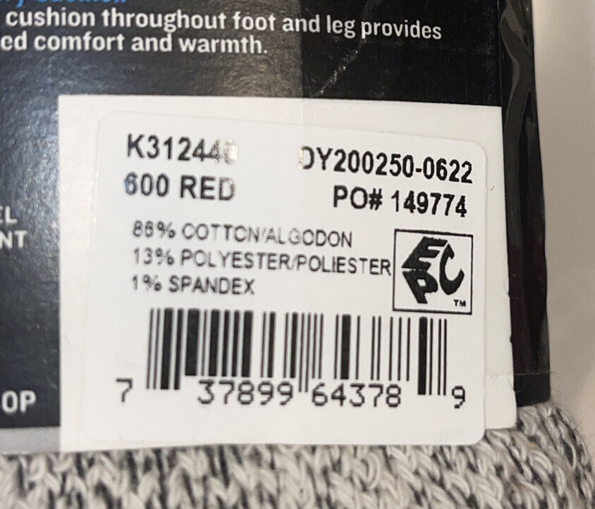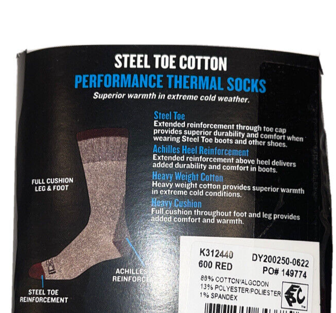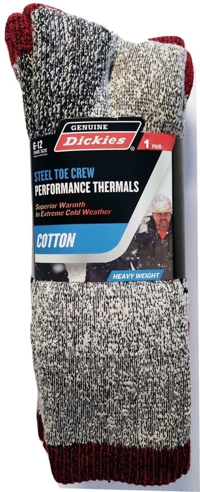 Genuine Dickies New Thermal Steel Toe Crew socks are the perfect sock to add to your cold weather wardrobe. These cotton thermals are designed to keep feet safe, warm and dry. The extra reinforcement in the boot cap protects your toes while wearing steel toe boots or other shoes. Full cushioning in the leg and foot puts comfort in every step and relaxes those tired feet.