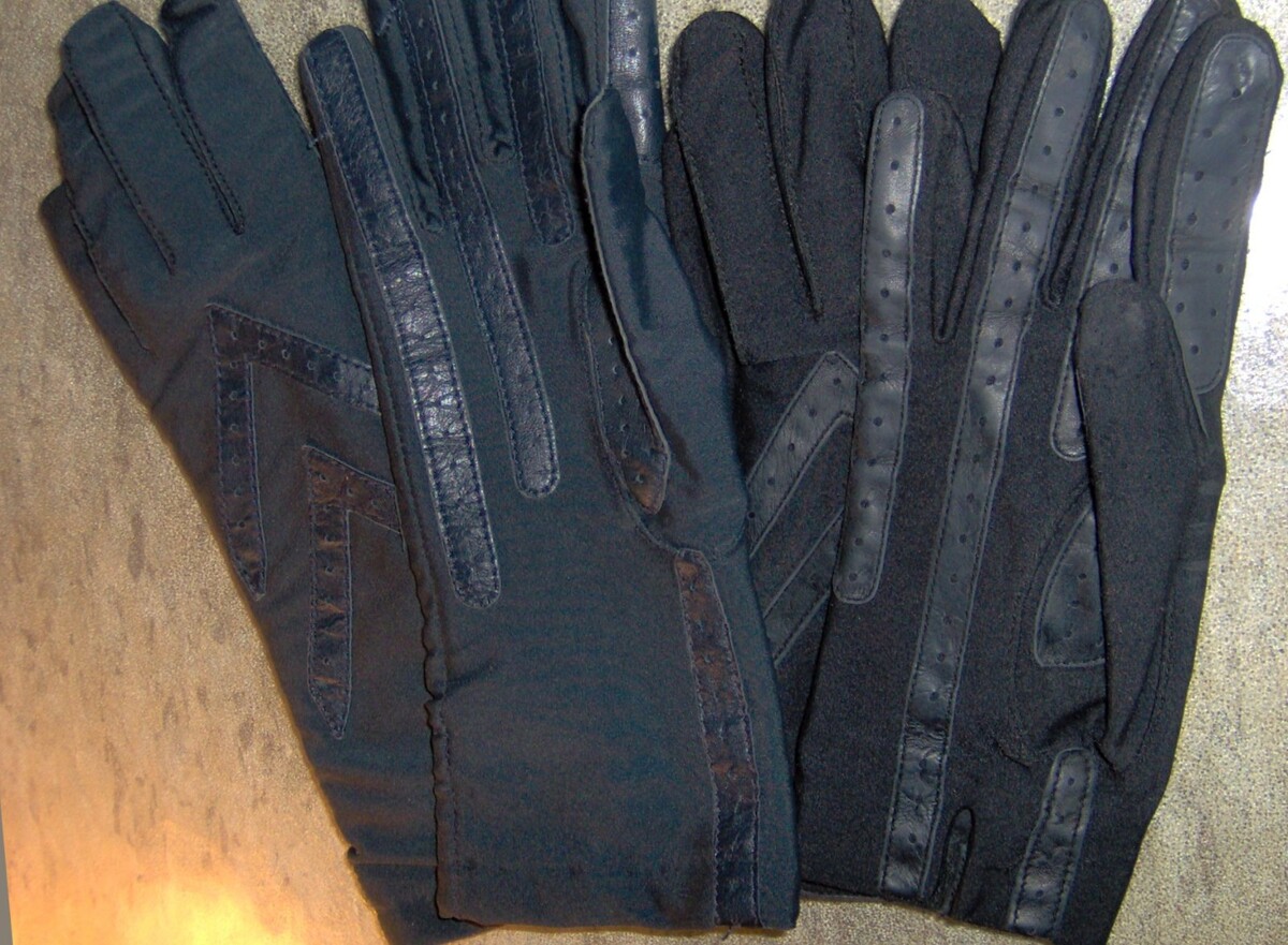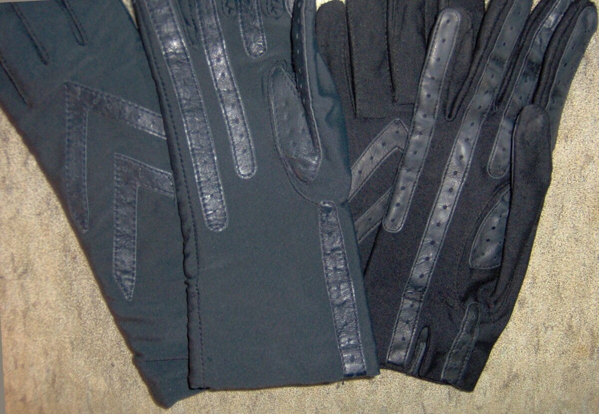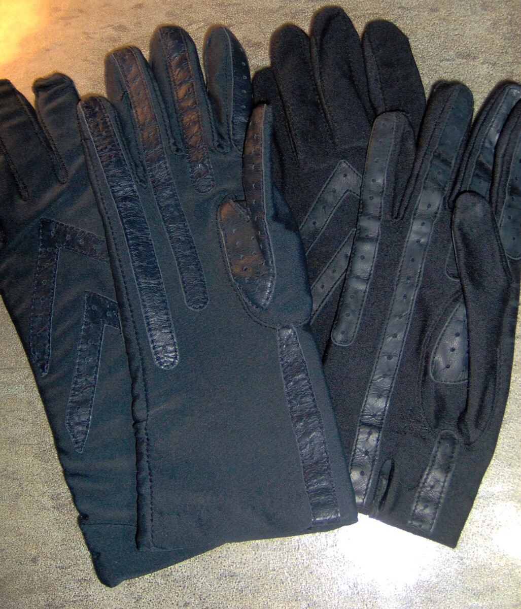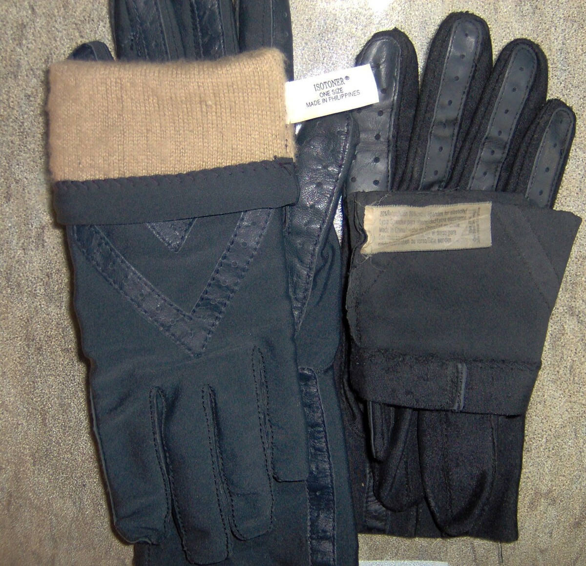 FOR SALE ARE TWO PAIRS OF VINTAGE USED ISOTONER BRAND GLOVES IN BLACK COLOR MANUFACTURED BY ISOTONER. MEDIUM TO GOOD CONDITION. BOTH PAIR ARE RATHER SIMILAR IN APPEARANCE WITH EXTERIOR NYLON/SPANDEX AND LEATHER ACCENT STRIPS ON BOTH SIDES THAT HELP WITH GRIP. THE LARGER PAIR HAS A FUZZY INTERIOR WHILE THE SMALLER PAIR DOES NOT. BOTH ARE LABELED "ONE SIZE" ON THE INTERIOR LABEL, BOTH ARE MADE OF 80% NYLON WITH SOME SPANDEX FOR THE STRETCHY FIT. THESE WERE LIKELY SOLD FOR WOMEN BUT COULD BE CONSIDERED UNISEX. THESE ARE CERTAINLY PRACTICAL DRESS IT uP A BIT GLOVES THAT LADIES WILL APPRECIATE FROM ISOTONER BRAND. YOU WILL RECEIVE TWO (2) PAIRS OF VINTAGE USED ISOTONER GLOVES, AS PICTURED, SHIPPED BY USPS....