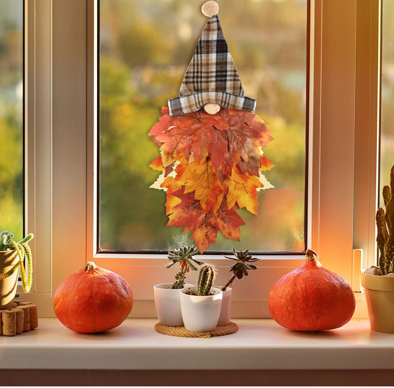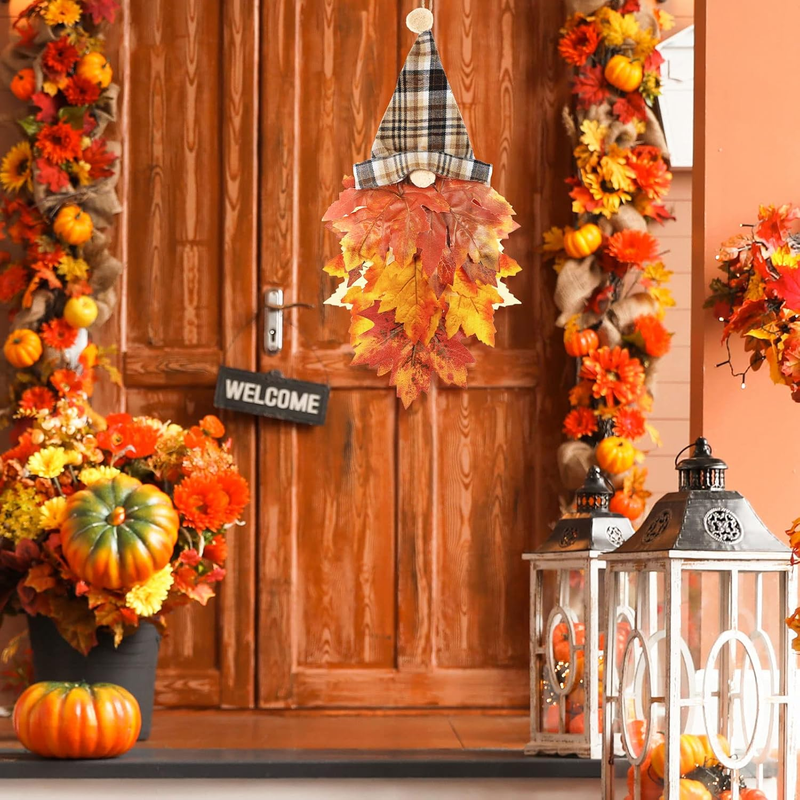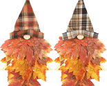 - 2 Pcs Fall Gnomes Maples Leaf Wreath for Front Door Autumn Gnome Hanging with Po