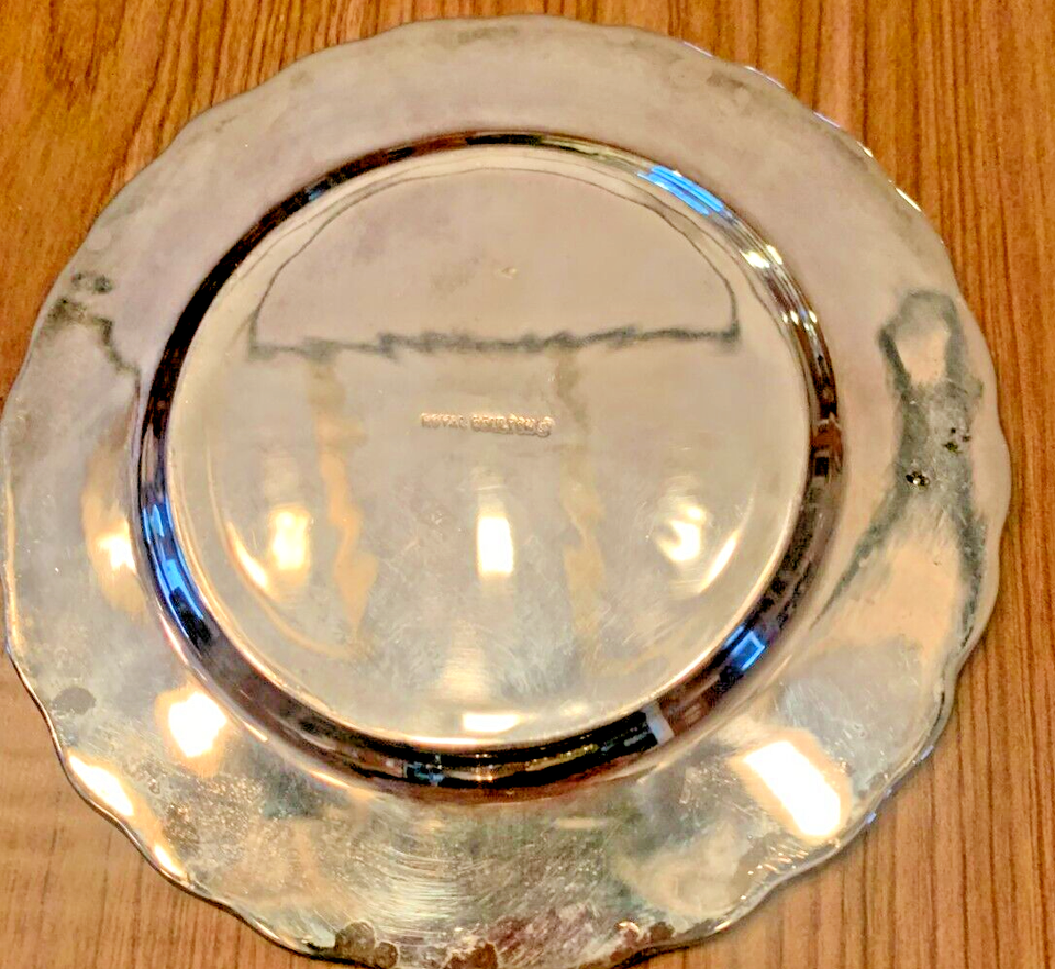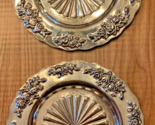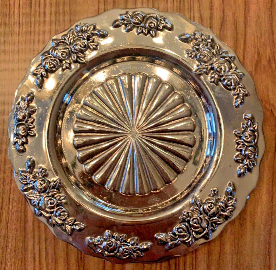 These round plates feature a silver plated high relief design with a high polish finish, measuring 5 inches in diameter.