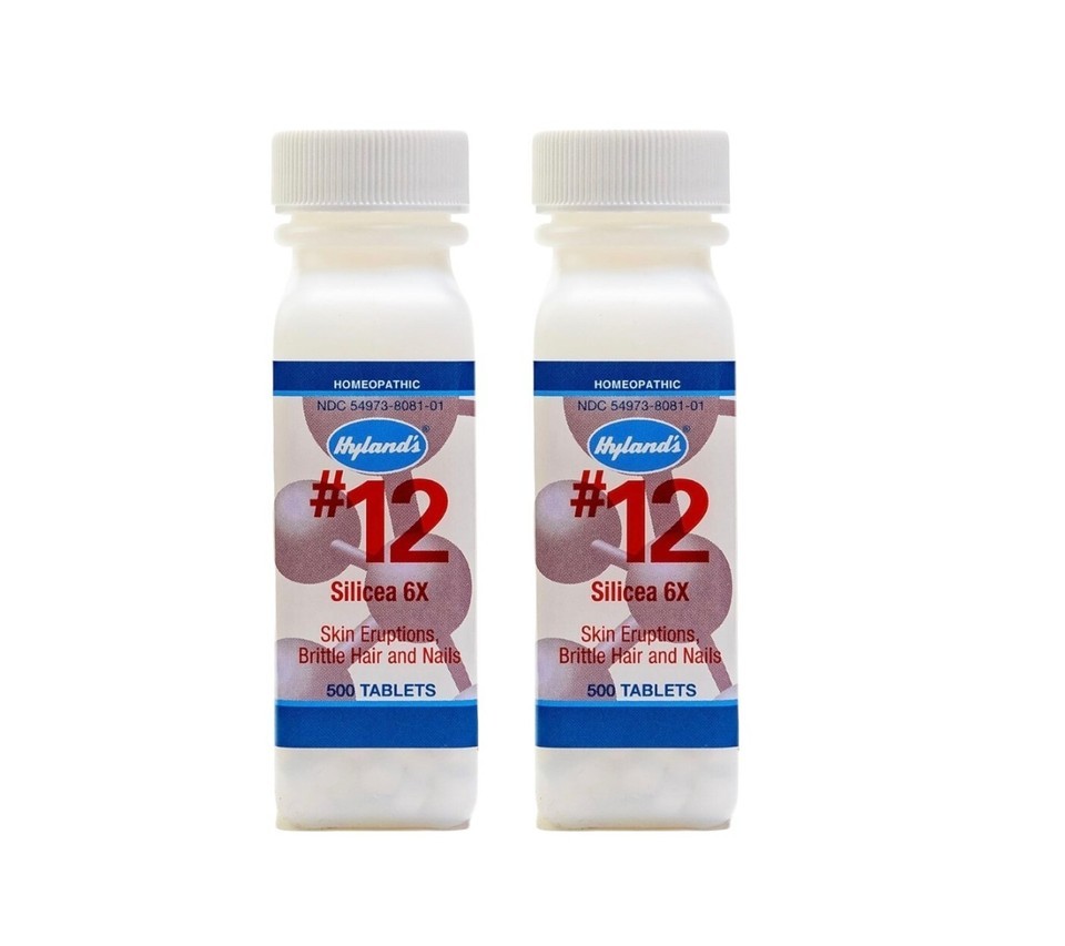 2 bottles of Hyland's #12, Silicea 6X, 500 Tablets, Skin Eruptions, Brittle Hair and Nails.