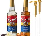 2 Syrup Pump Dispenser Bundle with Torani Coffee Syrup, Vanilla & Caramel Flavor