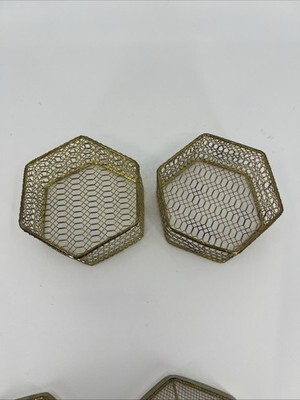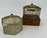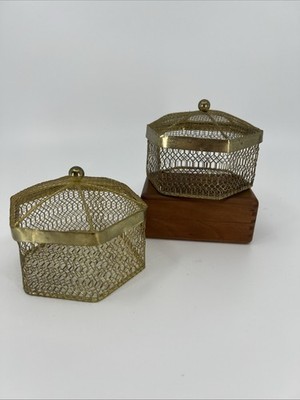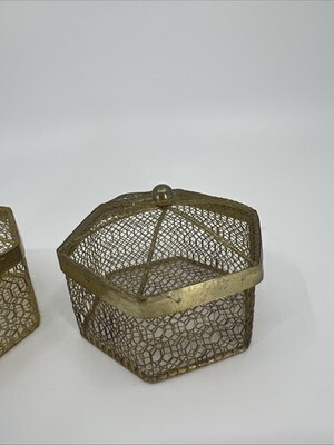- 2 VNTG Hexagon Gold Metal Mesh Jewelry Trinket Box W/Decorative Ball Finial Lid