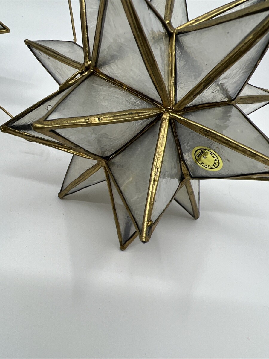 The product is a set of 2 VTNG Capiz Shell Moravian Stars Hanging Tea Light Lantern Candle Holders. These handmade candle holders are crafted from glass and metal, featuring an antique brass colored metal structure and display hanger. The lanterns are designed in a star shape, with a working door latch to insert tea light candles. Originating from the Philippines, these candle holders add a boho and decorative touch to any space. Perfect for holding mini candles and tea light candles, these lanterns are a unique and charming addition to any collection.
