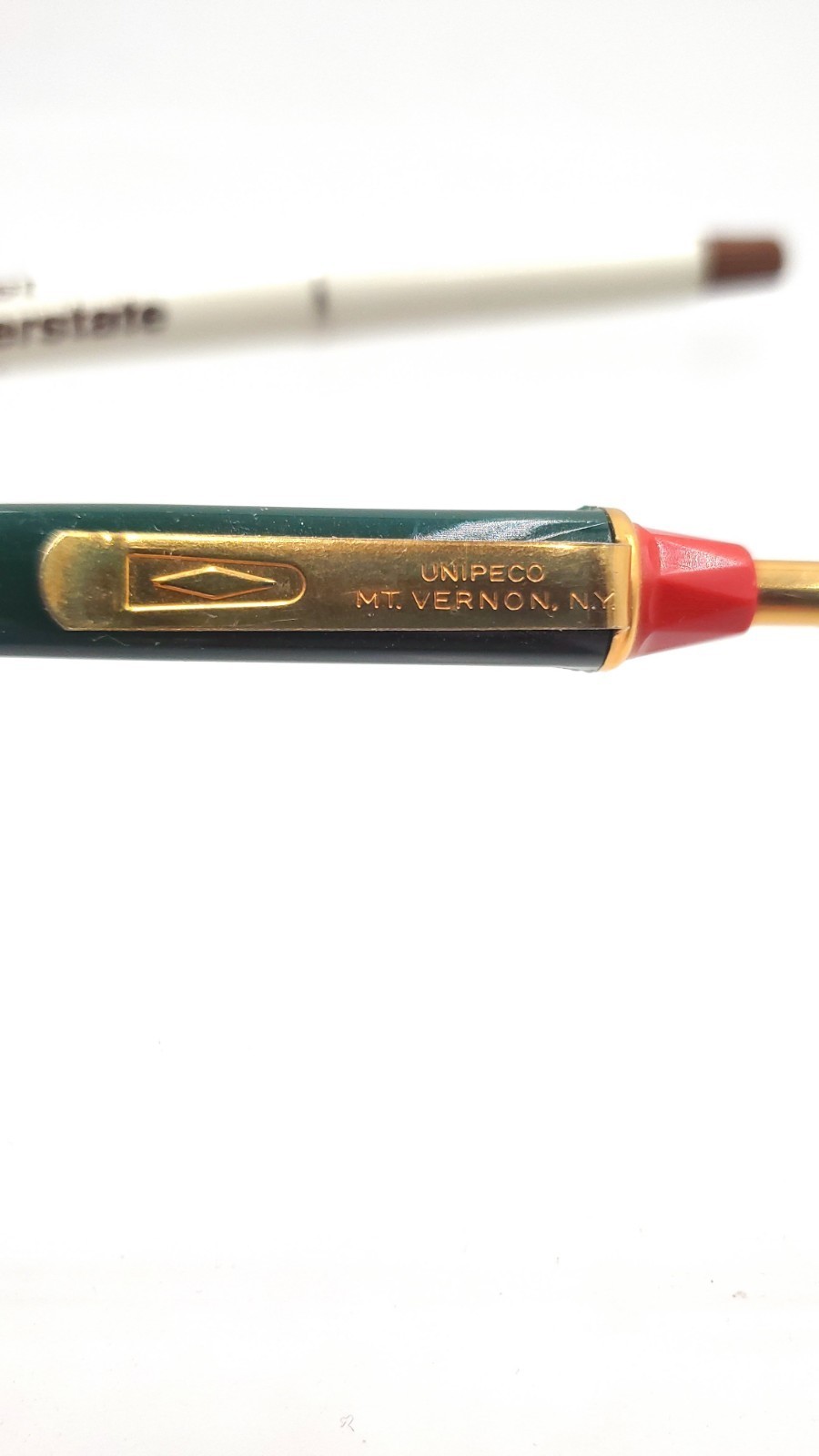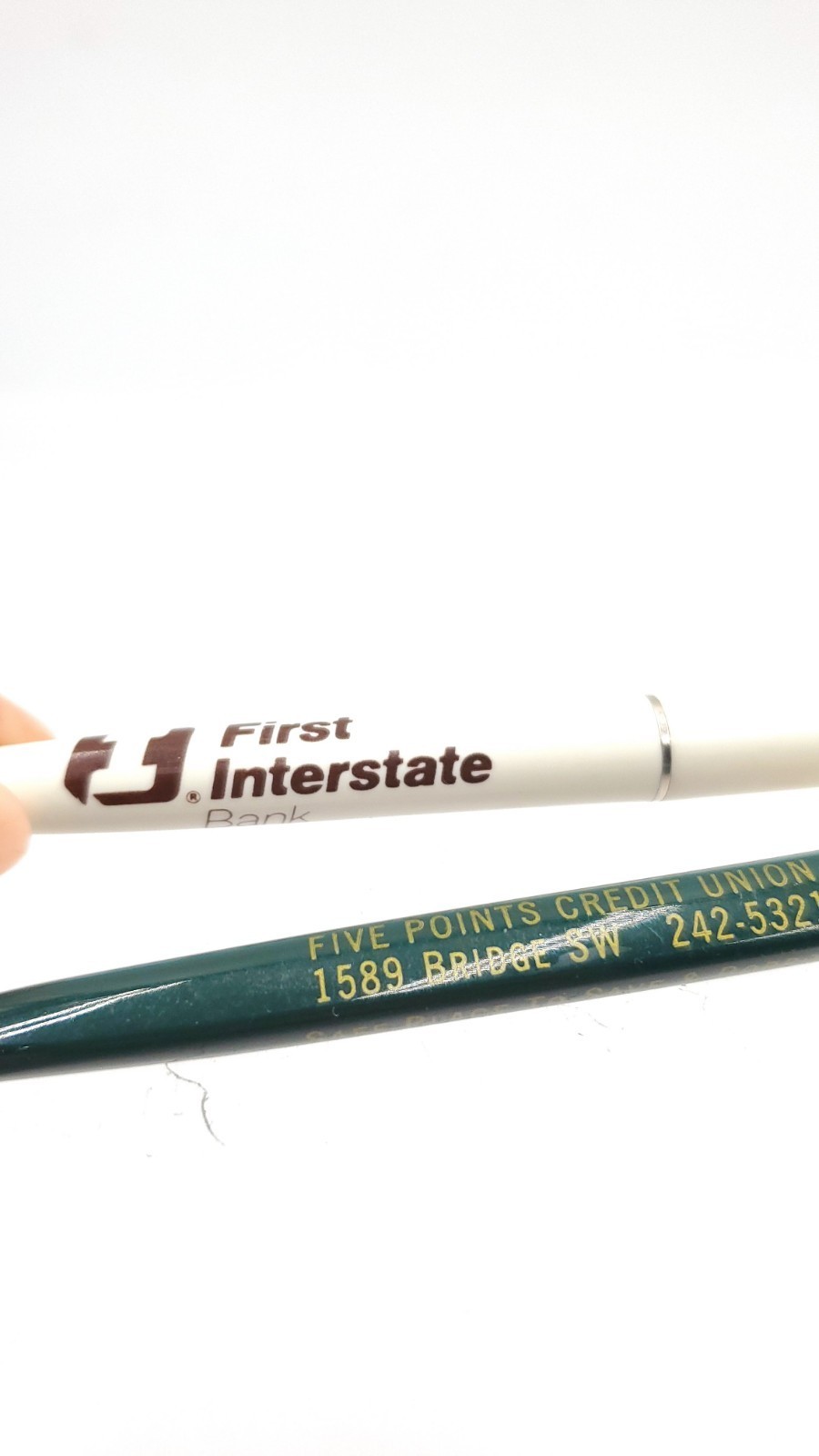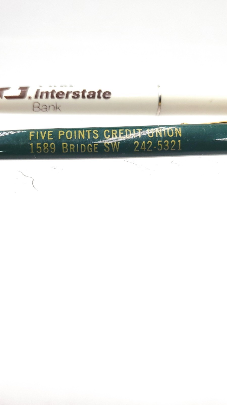 The white First Interstate pen works. The green one does not. Please review photos for item details. Give me a follow as I list from estate sales for new and vintage items.