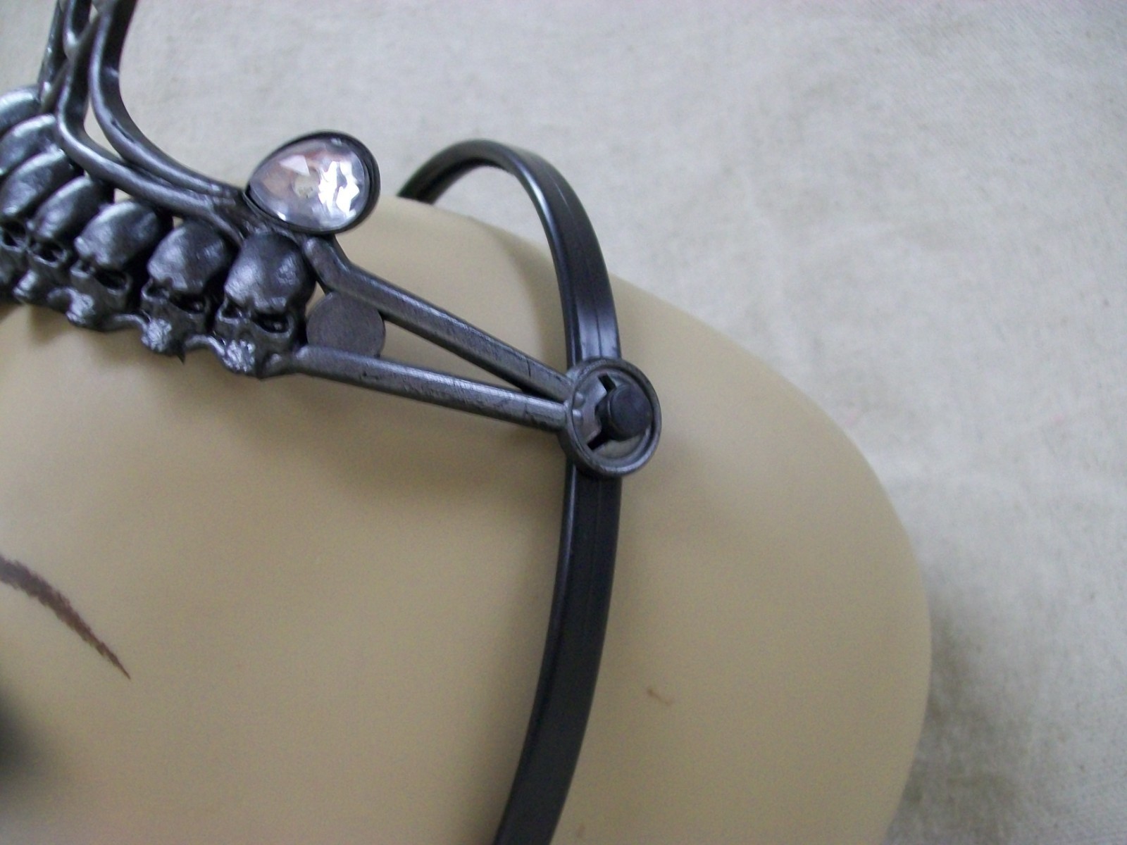 Plastic 2 Piece Gothic Themed Costume Tiara. Some of the jewels have a color tone or look to them. Some of the jewels have a black dot in the center and some don't. Different tones and textures in the gems may vary. Some of the silverish overspray paint has some marring or scuffs. Tiara front snaps on black headband. Easy Assembly. Not intended for use in play by children under 3 years of age. I'll check them before they leave. But there's a possibility jewels may come loose during shipping. They can be reattached with a dab of glue.