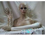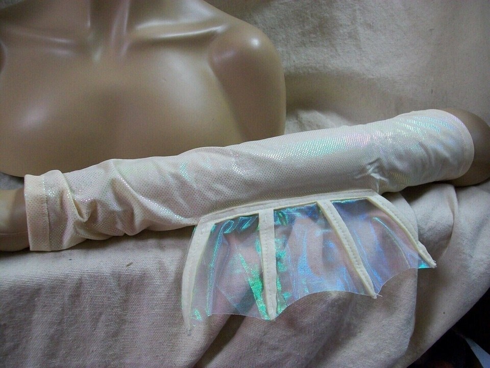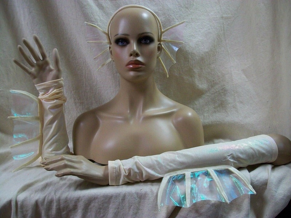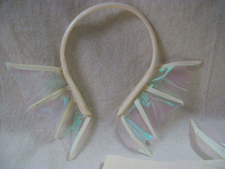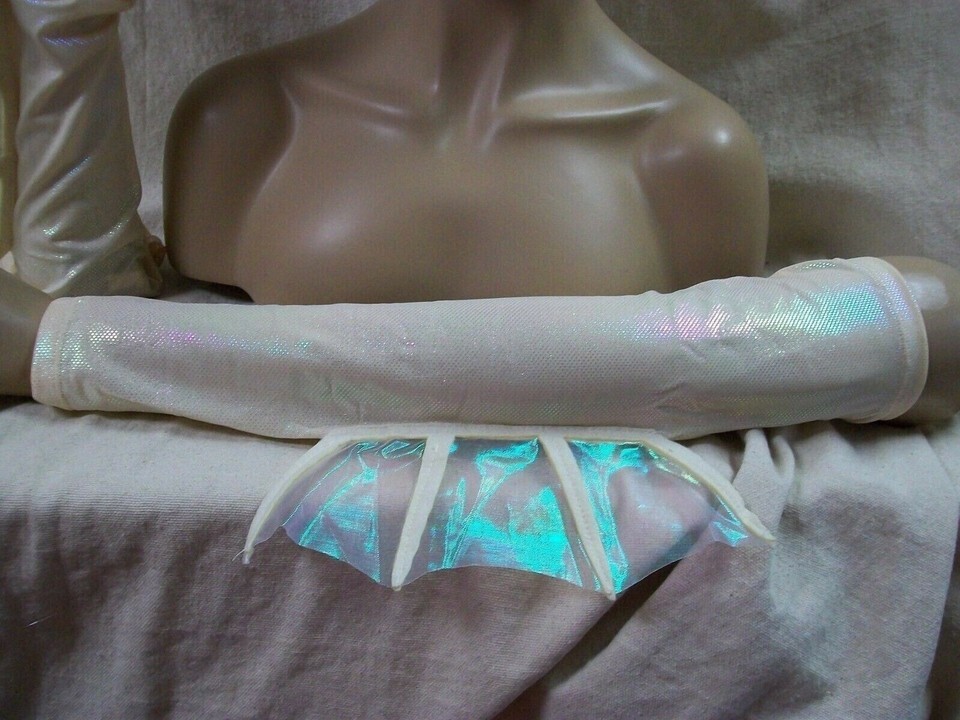 Soft flexible headband with sheer iridescent fabric webbed fin ears. The Fins fabric at the headband will need to be twisted around the headband to the fins positioned to stand out for wear as desired. Ears differ slightly from each other. One Pair of long armwarmer / sleeves with fins. Sleeves are longer. There's iridescent dots on the fabric that catch the light and look like different colors. Sleeves have sheer iridescent fabric fins attached to them as well. There's long threads that will need trimming all over. No age specs but most costume items are for ages 14 and up.