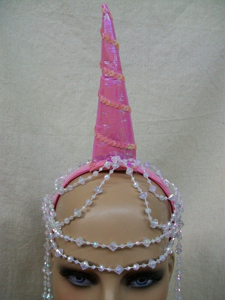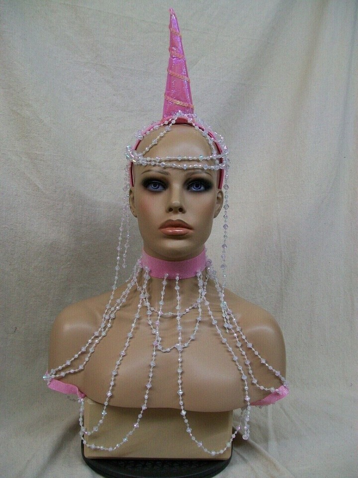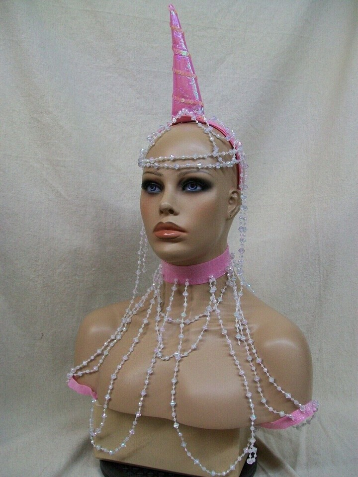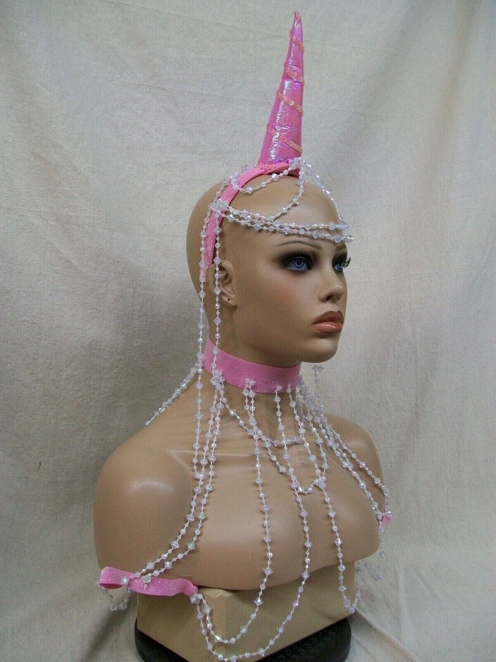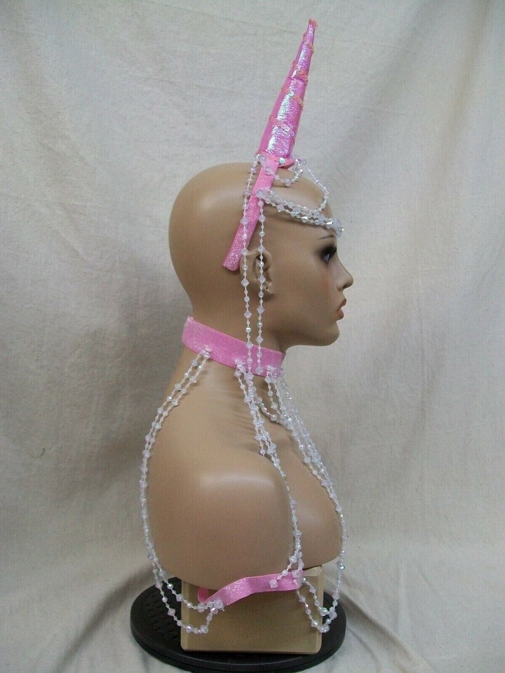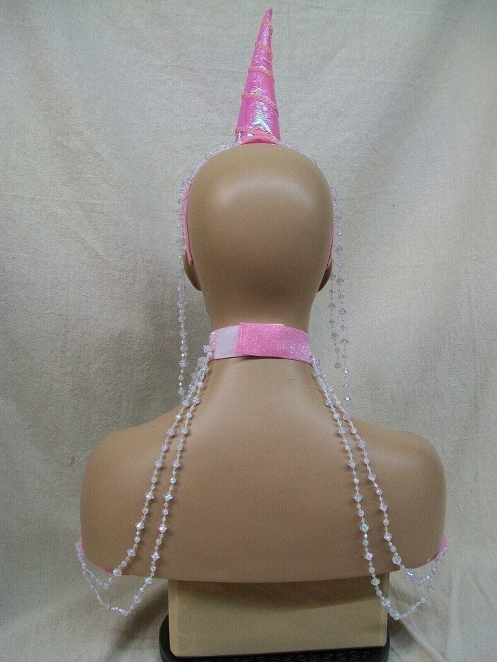 2 pc Showgirl Unicorn Costume Horn Headband with attached beaded strings and beaded harness. Pink iridescent Horn with sequins. Horn is stuffed with fiberfill and may need some shaping. Stretchy Elastic Pink Arm Straps and Choker. Choker looks short but has stretch to it. May fit tight on some. Length Unstretched it is approx. 14" and will stretch to approx. 18"-19". May fit more than that but would be tight and Velcro may not stay fastened. Can be worn by male or female. Adult: One Size Fits Most. Horn is Approx. 6.5" tall from base.