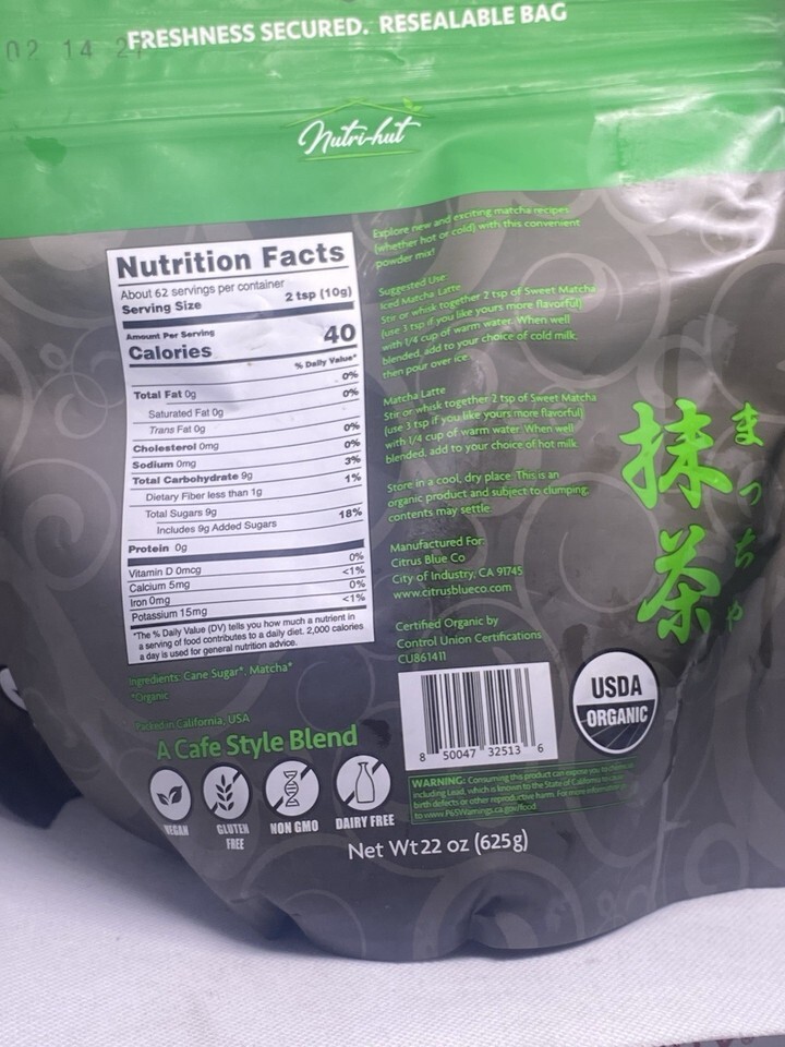 Nutri-hut Organic Sweet Matcha Premium Grade Green Tea 22 oz USDA Organic.