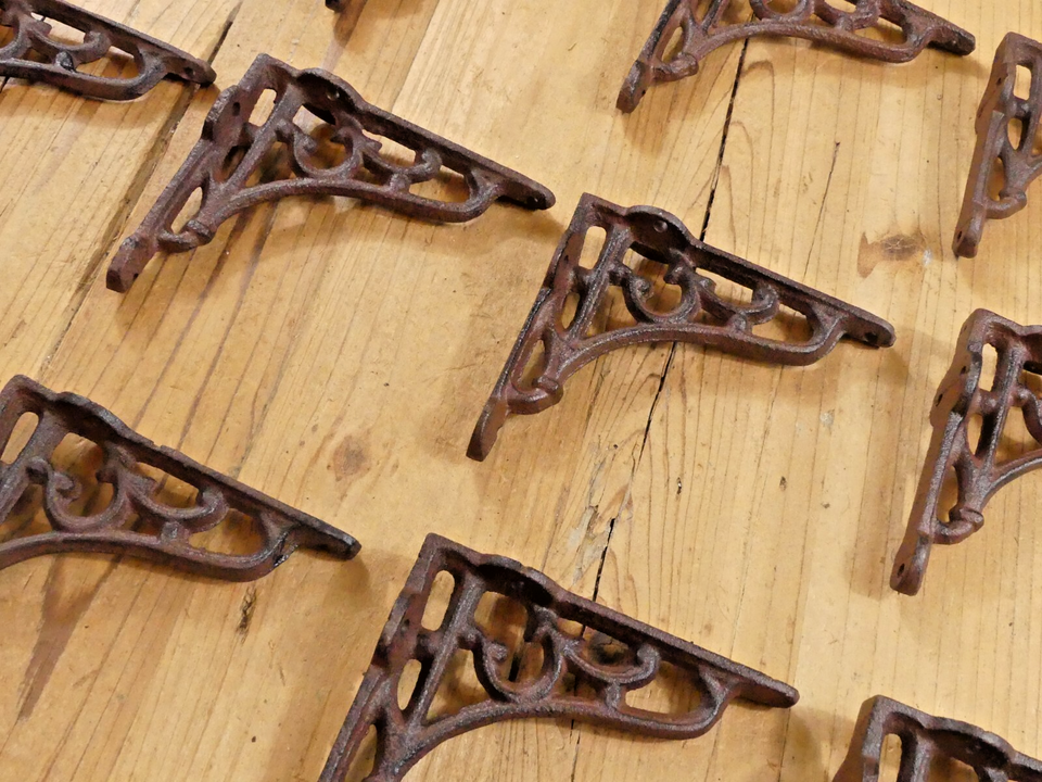 FOR SALE ARE 20 (TWELVE IN PICTURE, SALE WILL INCLUDE TWENTY) SMALL CAST IRON BRACKETS!