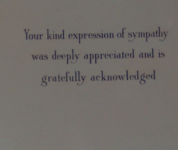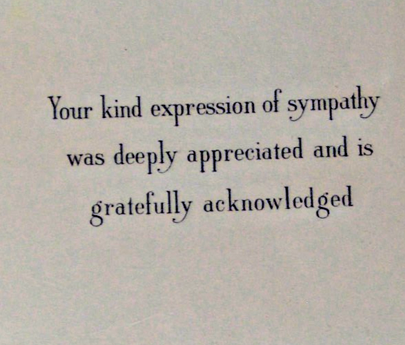 (1) NEW SEALED PACKAGE OF 20 CARDS AND ENVELOPES Your kind expression of sympathy was deeply appreciated and is gratefull acknowledged MANUFACTURED BY UNKNOWN MPN 20 UPC#. THESE ARE THE CORRECT WAY TO RECOGNIZE THOSE WHO ATTENDED THE FUNERAL OR HELPED OR EXPRESSED THE LOSS. TYPICALLY, THE FAMILY OF THE DECEASED WILL SEND THESE TO THOSE WHO SENT FLOWERS, ATTENDED SERVICES, GAVE HELP, OR WENT THE EXTRA MILE. THEY SIMPLY ACKNOWLEDGE THE KINDNESS AND SAY THANK YOU ON BEHALF OF THE FAMILY OF THE DECEASED. THIS BOX IS FACTORY SEALED. YOU WILL RECEIVE ONE (1) NEW, AS PICTURED, SHIPPED BY USPS....