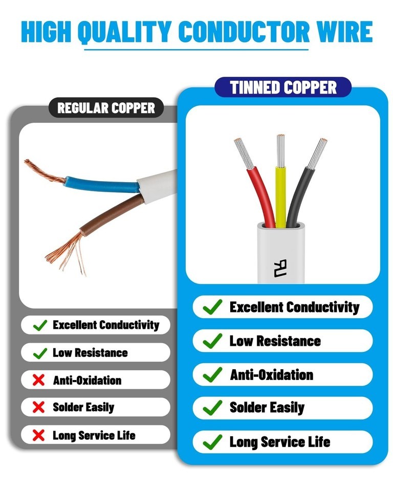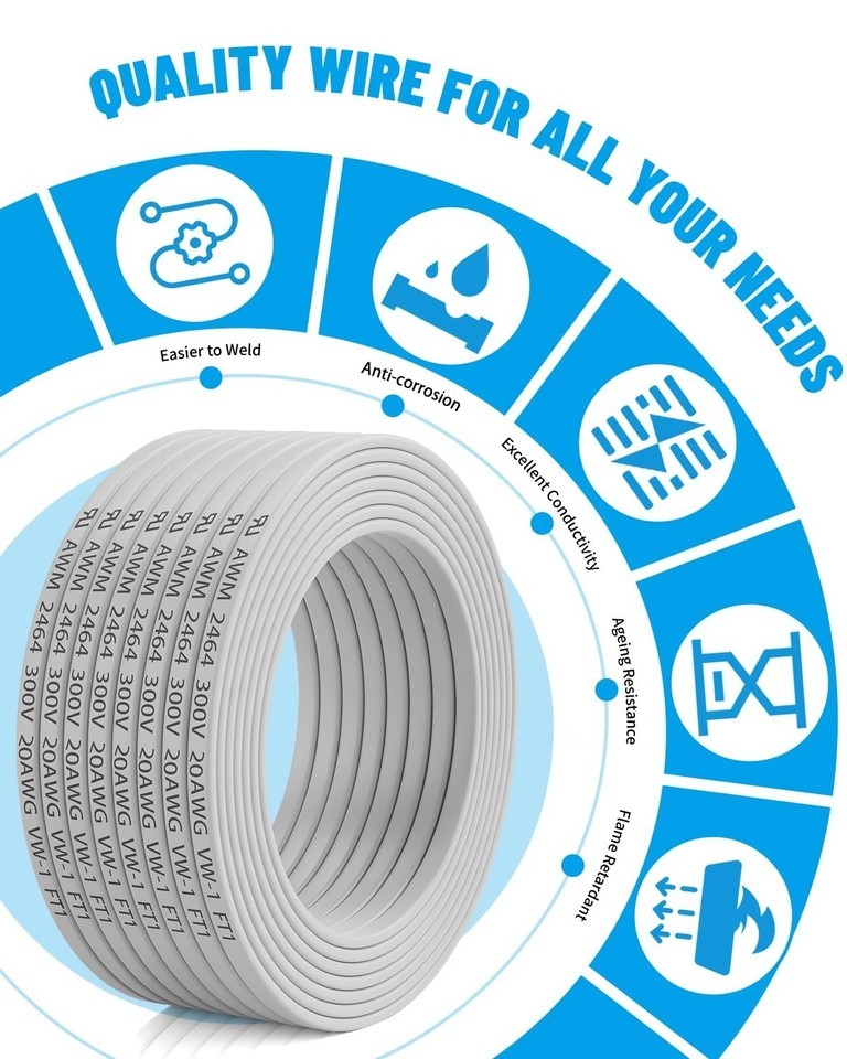 20 gauge wire made of high-purity oxygen-free tinned copper, 26 strands per cable 0.16 mm, with excellent conductivity, low resistance and ultra-low eccentricity, corrosion resistance, long service life