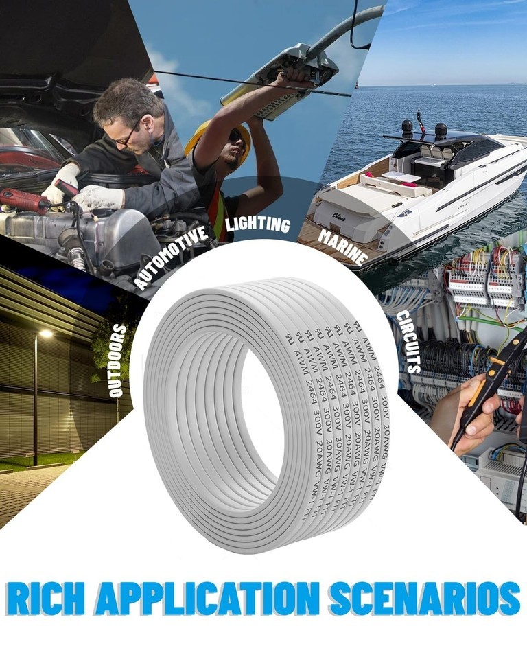 This 20 gauge white flat 3 wire cable is ideal for low voltage outdoor, lighting systems, automotive applications, home circuitry systems, and other everyday environments, including use as internal wire for LEDs, automobiles, appliances, marine, landscape lighting, electric motors, electronics, etc