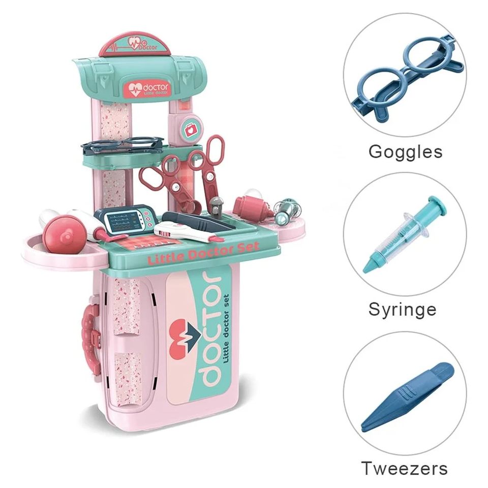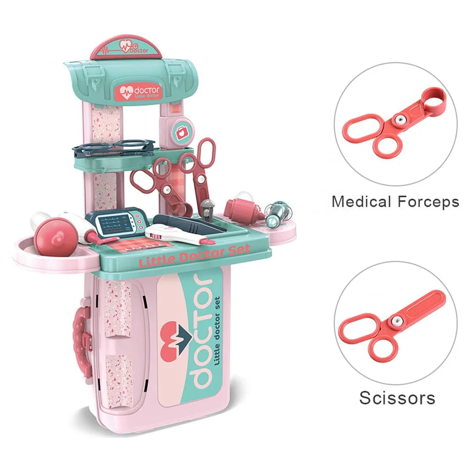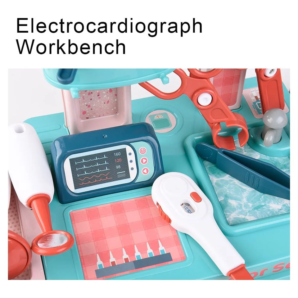 Package list: 1* suitcase; 1* paper box; 1* paster; 1* main workbench; 1* left extended workbench; 1* right extended washbasin; 1* support rod; 1* suitcase signboard decoration module; 1* half moon decoration module; 1* ruler decoration module; 1* water faucet; 1* goggles; 1* syringe; 1* mouth mirror; 1* thermometer; 1* doctor hammer; 1* medical forceps; 1* scissors; 1* tweezers; 1* electrocardiograph