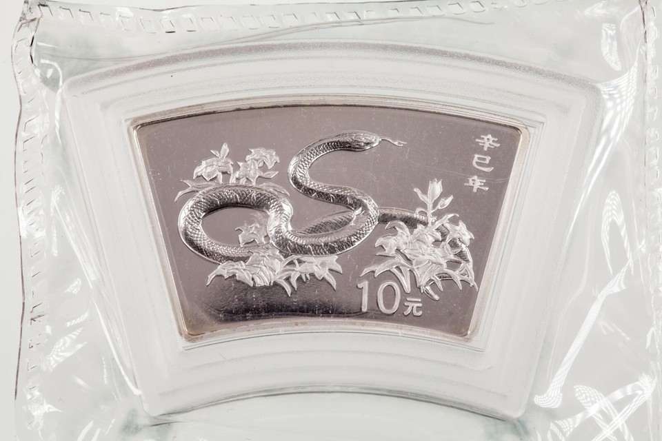 Includes CoA, which Reads: The Commemorative Silver Coin of Year of the Snake 2001 is legal tender of the People's Republic of China, issued by the People's Bank of China, minted by Shanghai Mint, and solely distributed by China Gold Coin Incorporation. The obverse depicts the title of PRC and the year date, and the gate tower Chenghai Lou of the Great Wall. The reverse features a snake and the face value. It is a 30 degree fan shaped silver coin, 99.9% in fineness, 10 yuan in face value, and contains 1 ounce of pure silver. The total mintage is 66,000 pieces. This is to certify that the coin is Bu, in quality and is up to standard as to its fineness and its weight.
