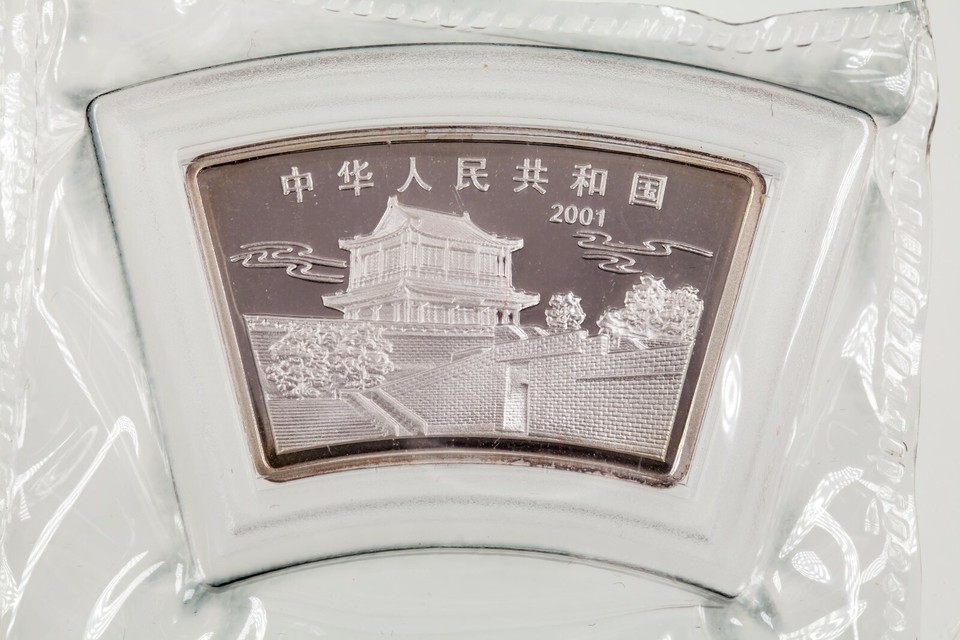 - 2001 Commemorative Silver Coin China 10 Yuan Fan Shaped w/ Box and CoA