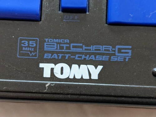 A vendre est un Tomy Bit Char-G Chase Set 57 MHz 2001 fonctionnel, telecommande de voiture jouet bleue.