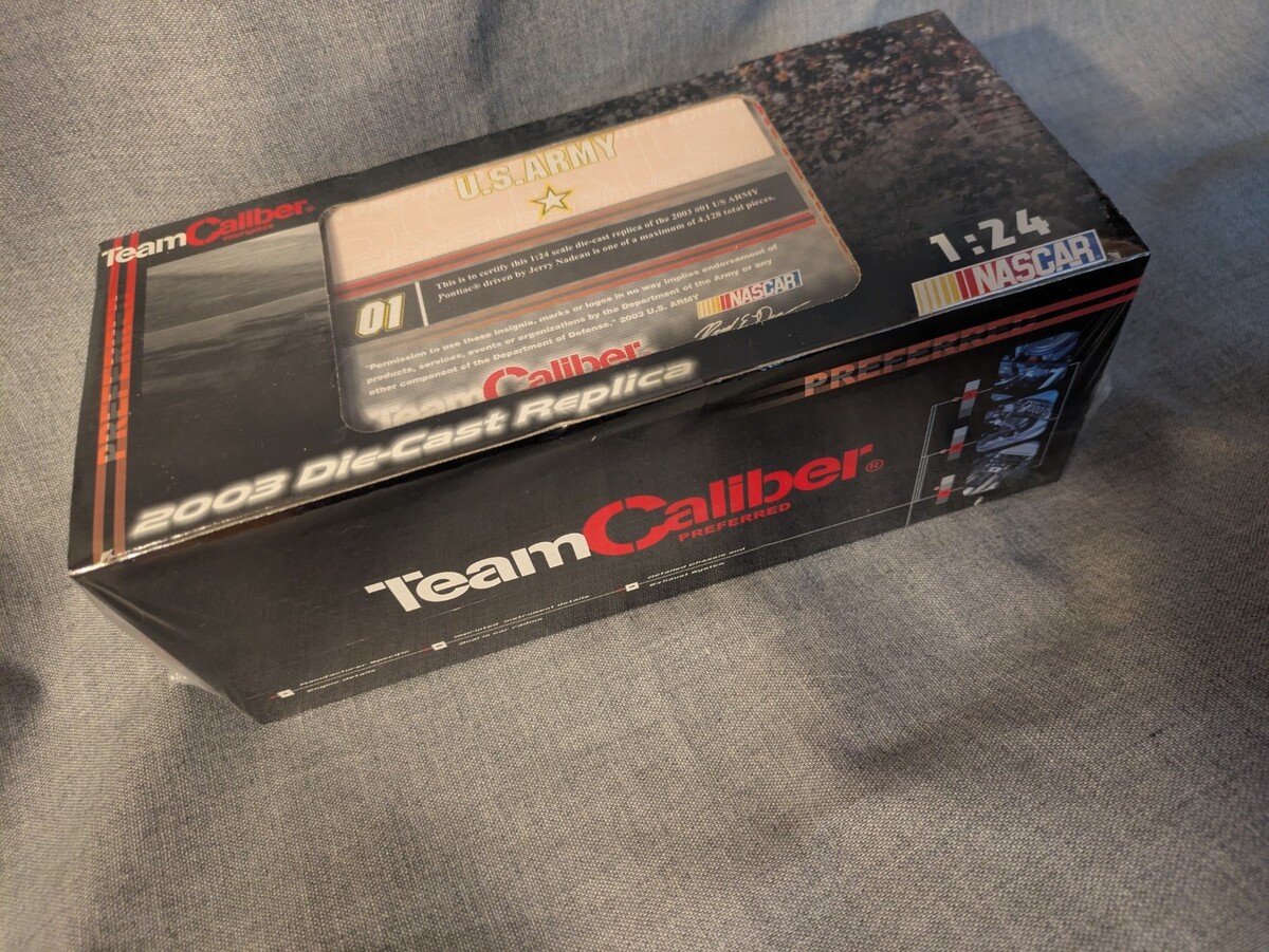 The product is a 2003 Jerry Nadeau #01 US Army Camouflage Pontiac Grand Prix 1:24 scale diecast NASCAR racecar by Team Caliber Preferred. This collectible item is a representation of the vehicle driven by Jerry Nadeau in the NASCAR racing series, featuring intricate details and is a must-have for fans and collectors of NASCAR memorabilia. The camouflage design adds a unique touch to the model, making it a standout piece in any diecast car collection.