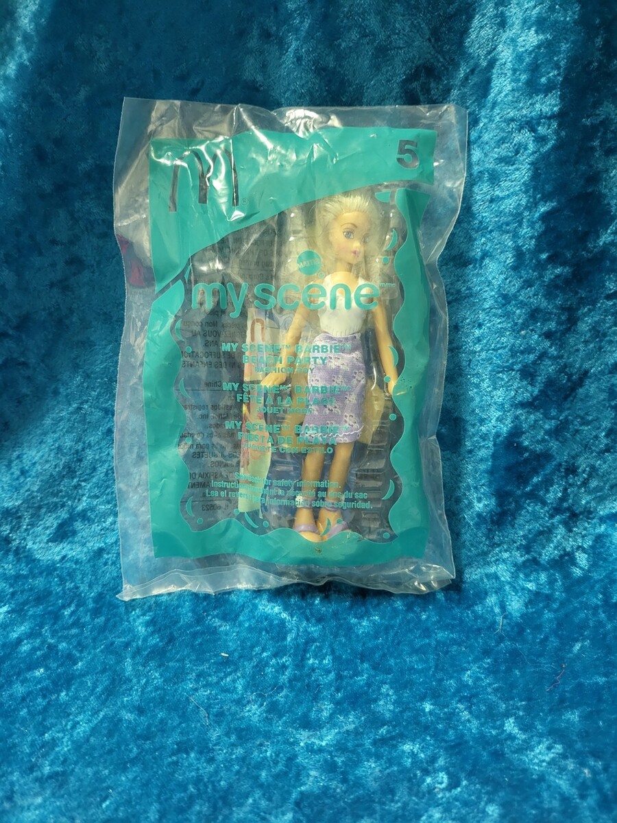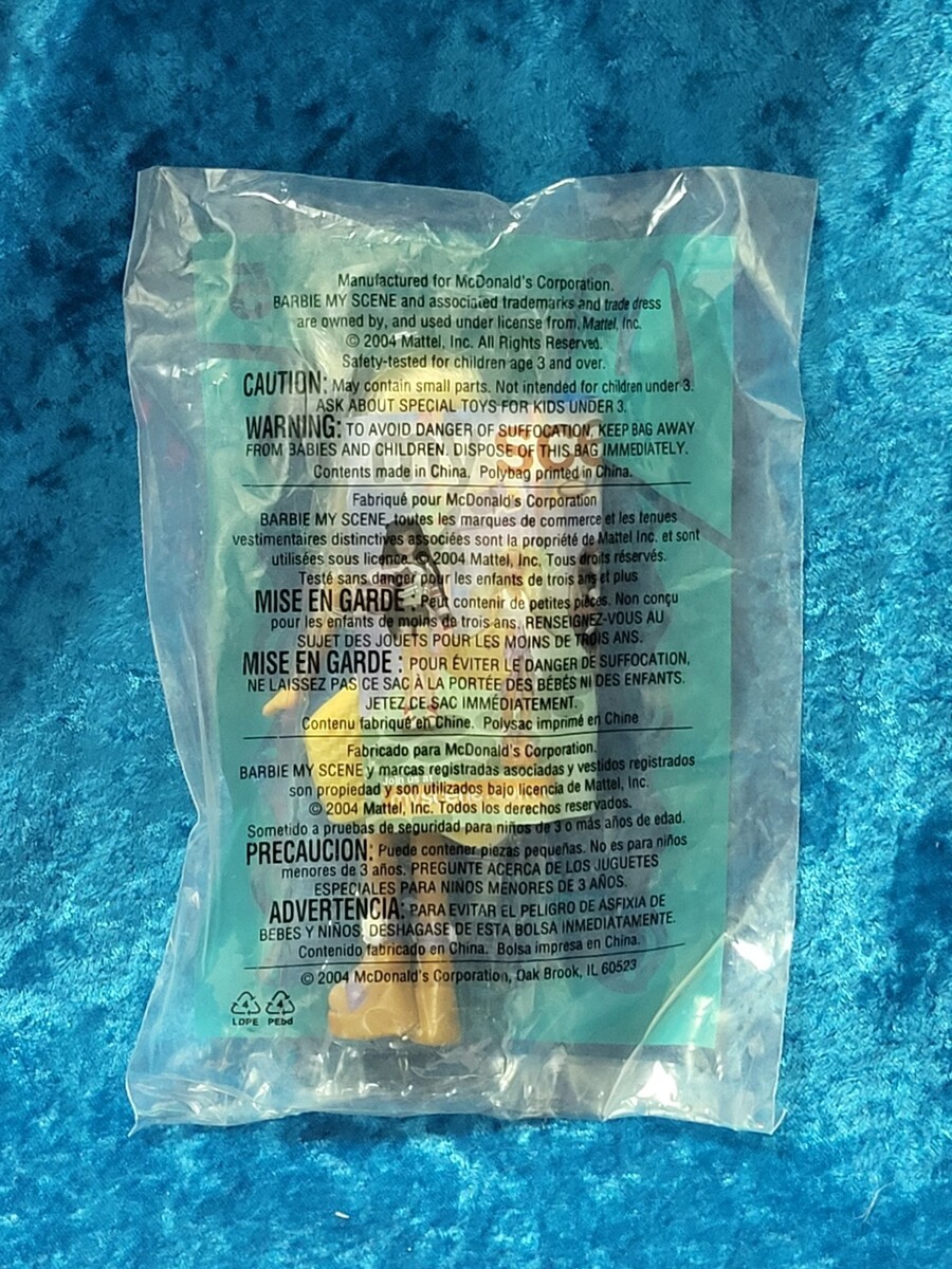 The product is a 2004 My Scene Barbie McDonald's Happy Meal Toy featuring BARBIE, part of the My Scene character family. This toy was manufactured by Mattel in China and is a part of the Fast Food Cereal Premiums category in the Toys Hobbies section. It is specifically designed for children aged 3-7 years old and is a collectible item that would have been included in a McDonald's Happy Meal toy set in 2004.