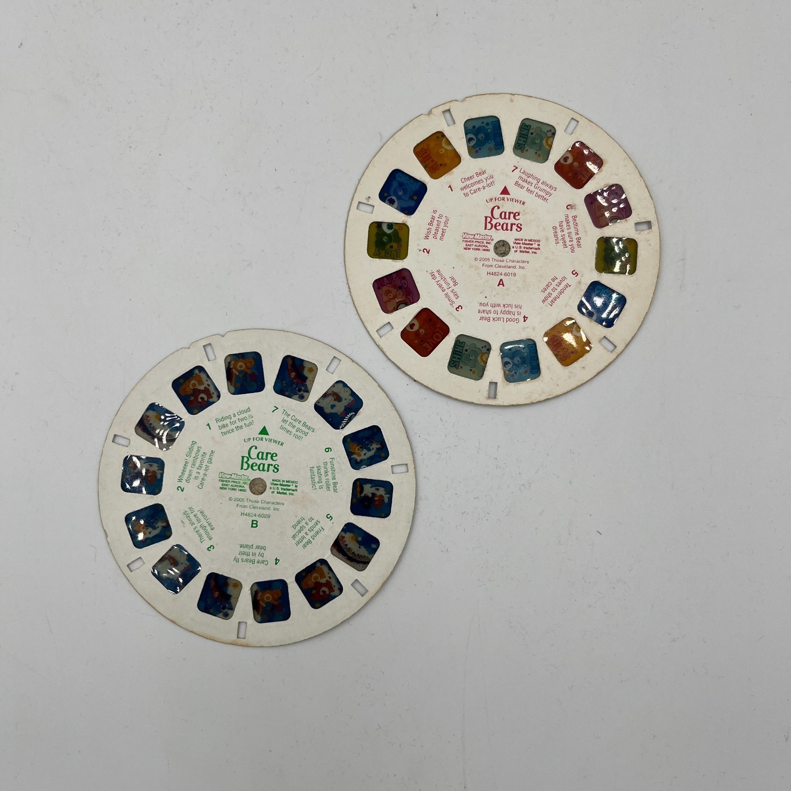 2000 View-Master Care Bears reels. This is for 2 different reels. Pictures are all intact and clear. They look great! One reel has some discoloration on it . See photos for details.