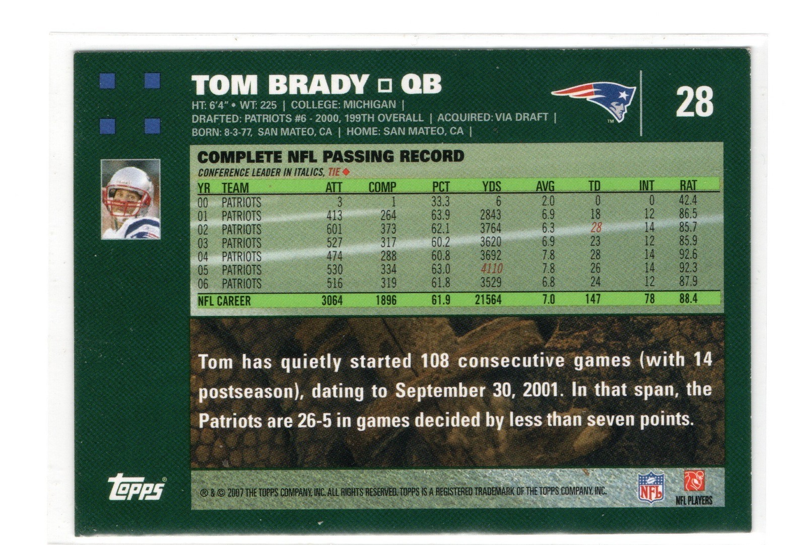 Hello, up for sale is a 2007 Topps Football Tom Brady #28. Card is in near mint or better condition and scanned in penny sleeve. Please see scans of actual card you will receive. Card will be shipped in a sleeve/semi rigid protector with standard envelope shipping. Be sure to check out my store for more. Add 3 or more items to cart and save 20%! Thanks for viewing.