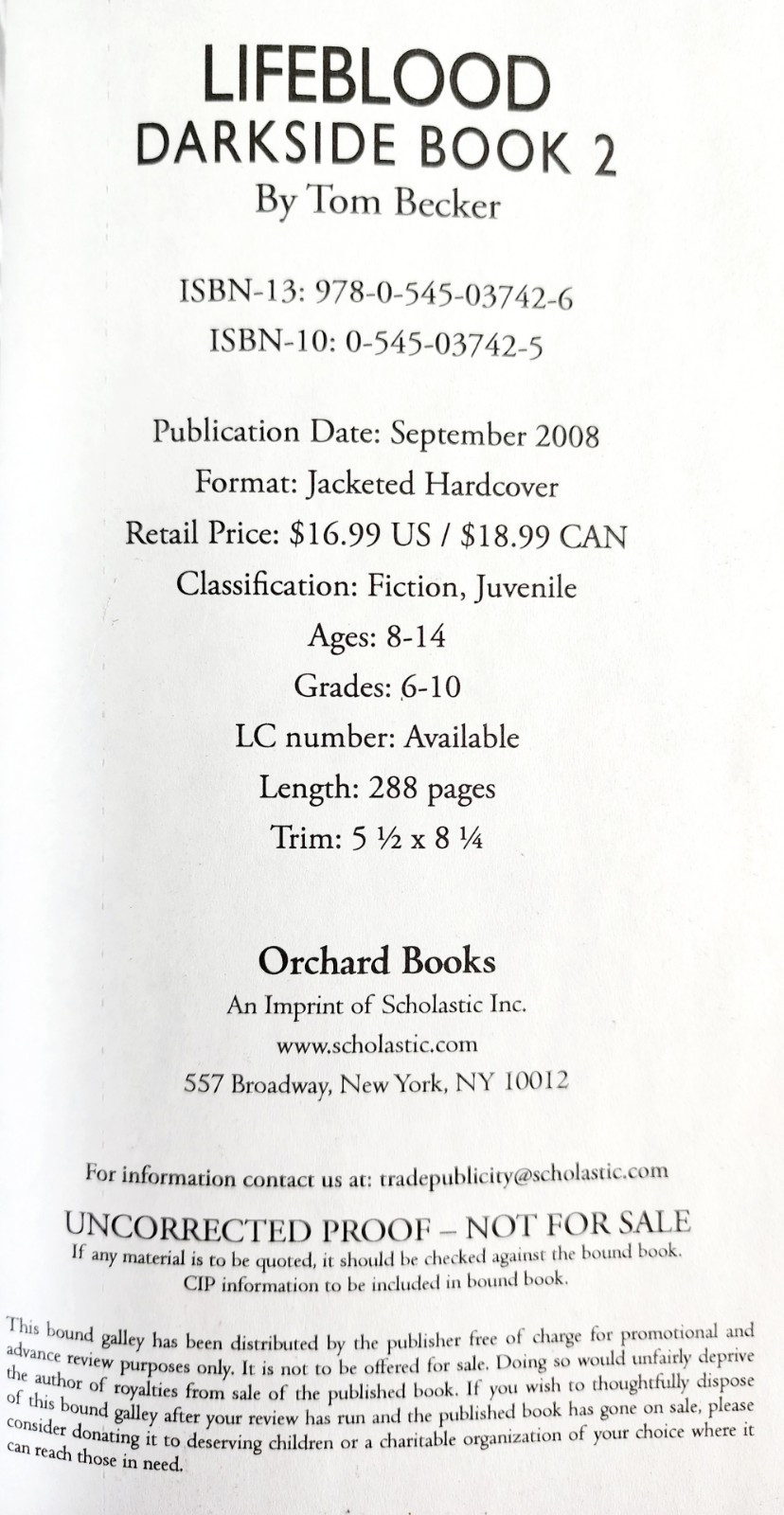 - 2008 Lifeblood Darkside Book 2 Uncorrected Proof Edition Tom Becker Horror E97